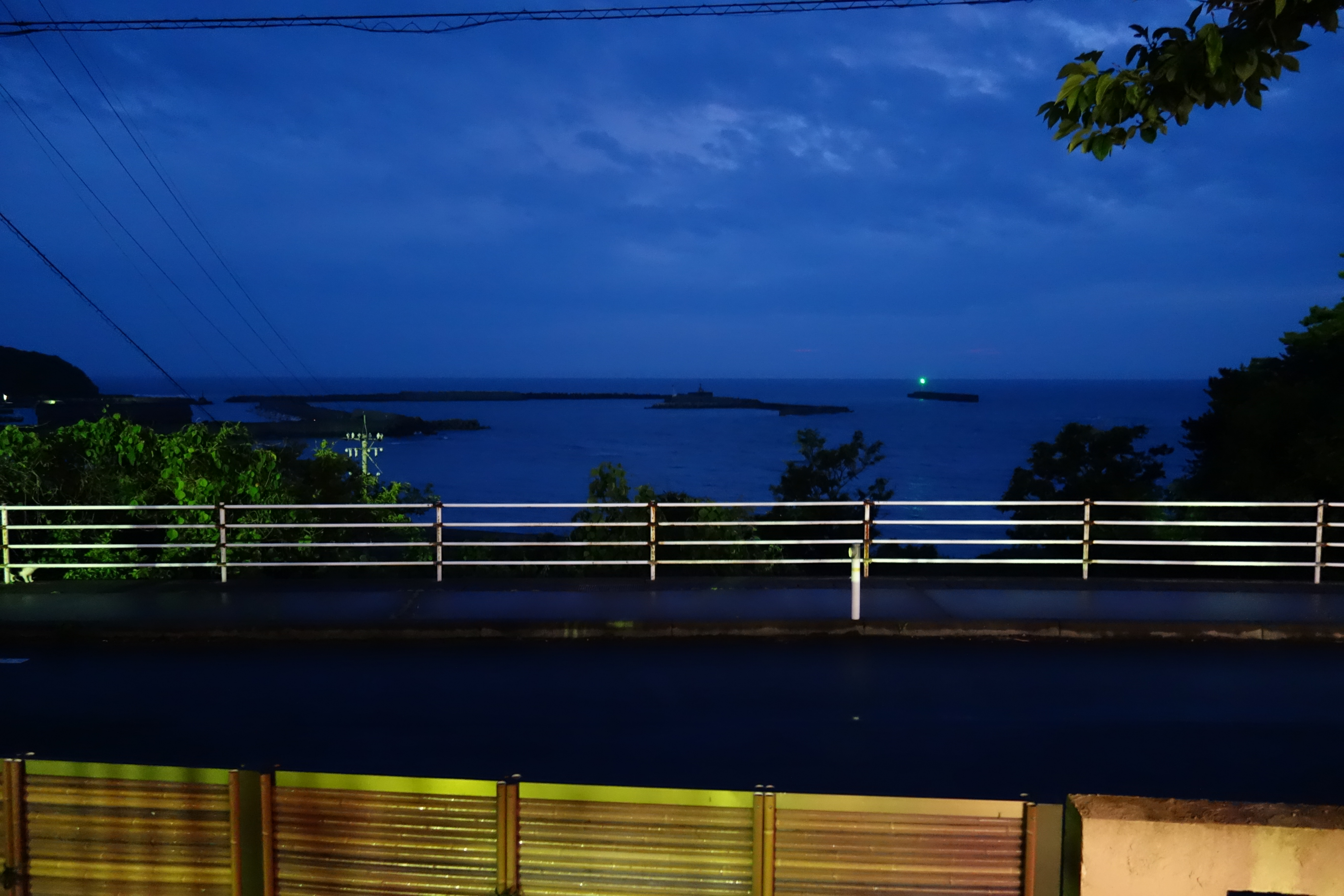 写真はレストラン付近から見た尼御前岬の方向と思われる夕闇の海です。
