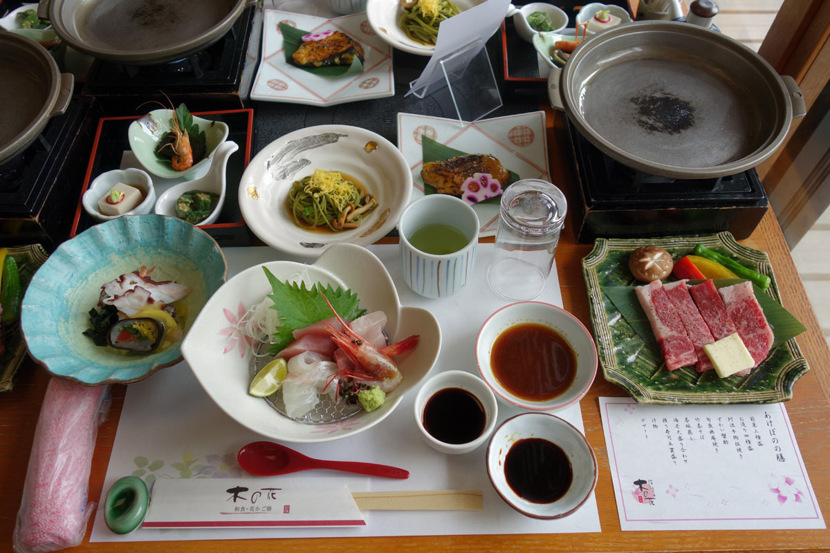 こちらが会食の料理「あけぼのの膳」。この後、天ぷら、茶碗蒸し、寿司5貫も出てきました。朝食控えめで正解でした。