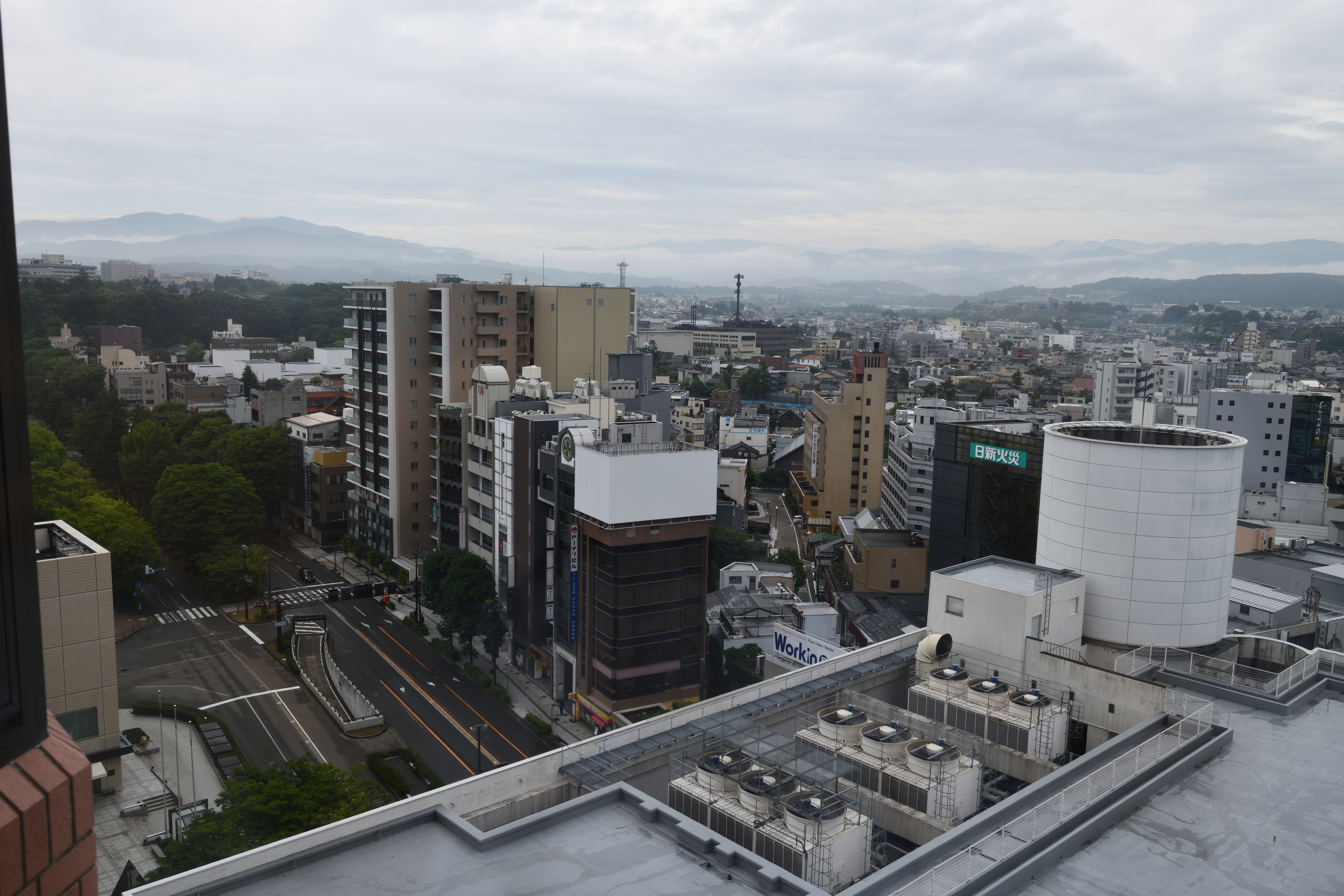 これはホテルの窓から見た金沢市内で、左側の並木が兼六園や金沢城へ向かう百万石通です。