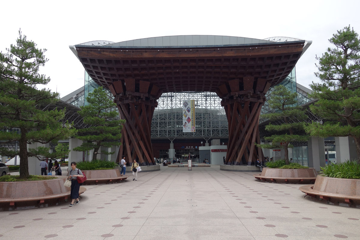 バスに乗ろうか迷った末、近いので歩いて金沢駅へ。巨大な鼓門があります。