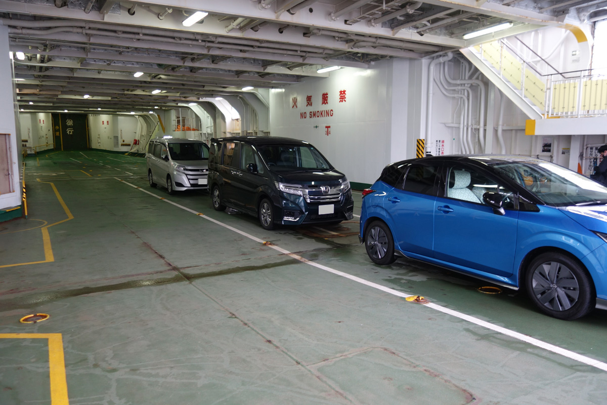 乗船です。クルマでフェリーに乗るのは実に久しぶり。1990年頃に東九フェリーで徳島に行って以来ではないかと思います。