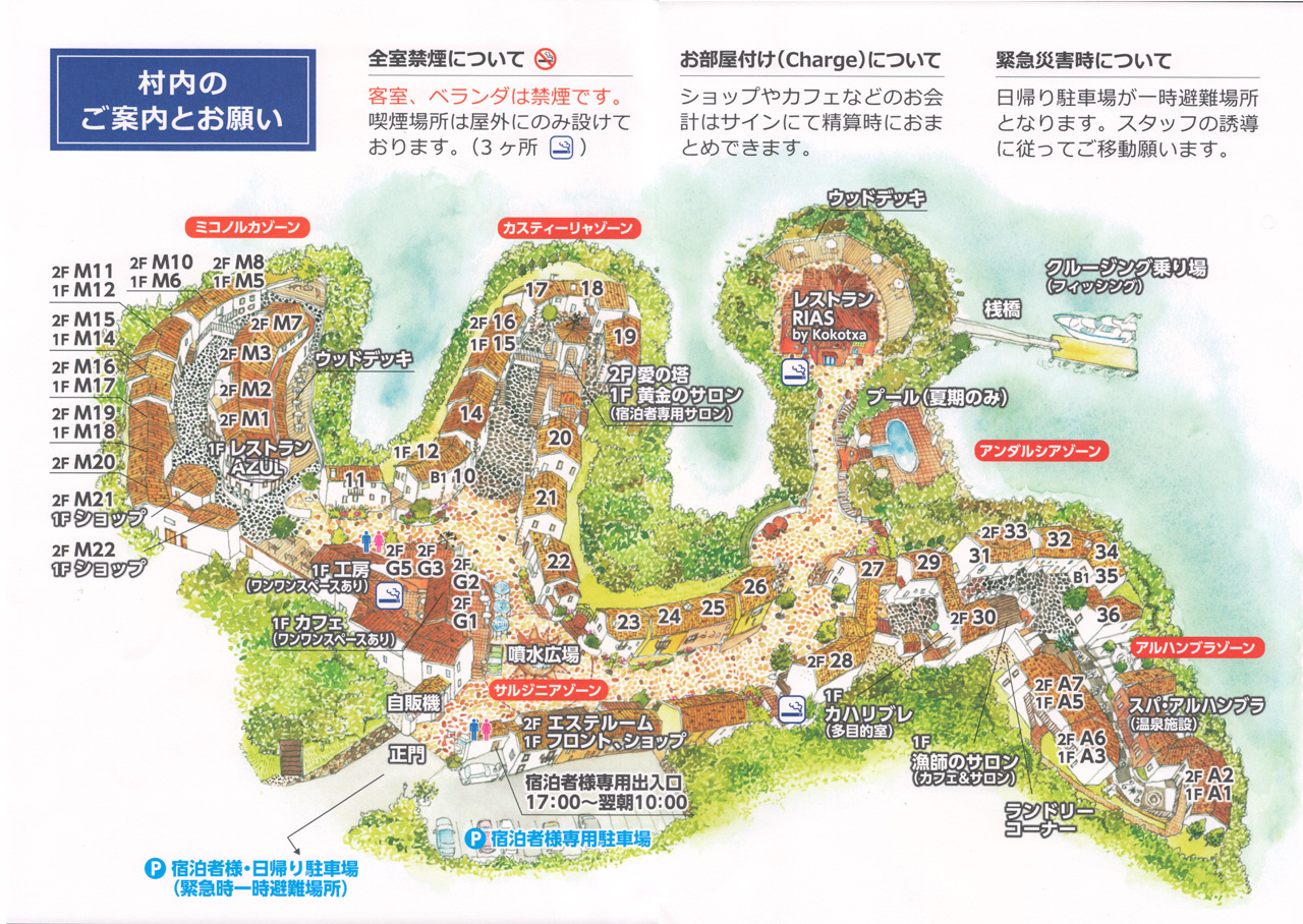 地中海村のマップです。レストランAZULは左端のミコノルカゾーンにあり、宿泊したのは右端のアルハンブラゾーンのA7なので食事の度に結構歩きます。