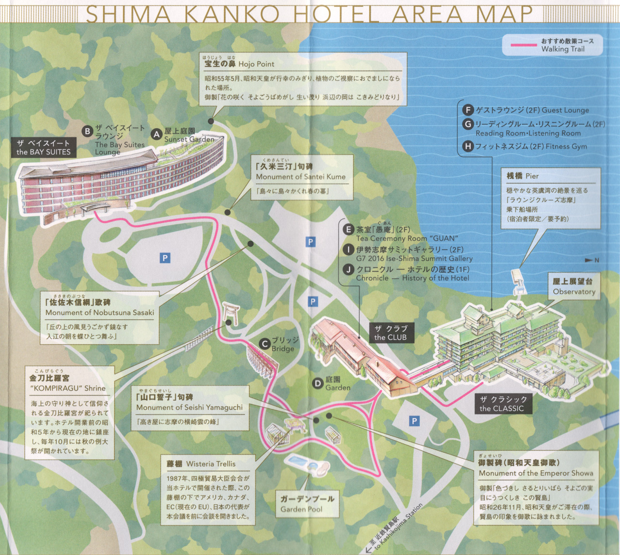 志摩観光ホテルの敷地マップです。ザ ベイスイートとザ クラシックの間に遊歩道があり散策できます。