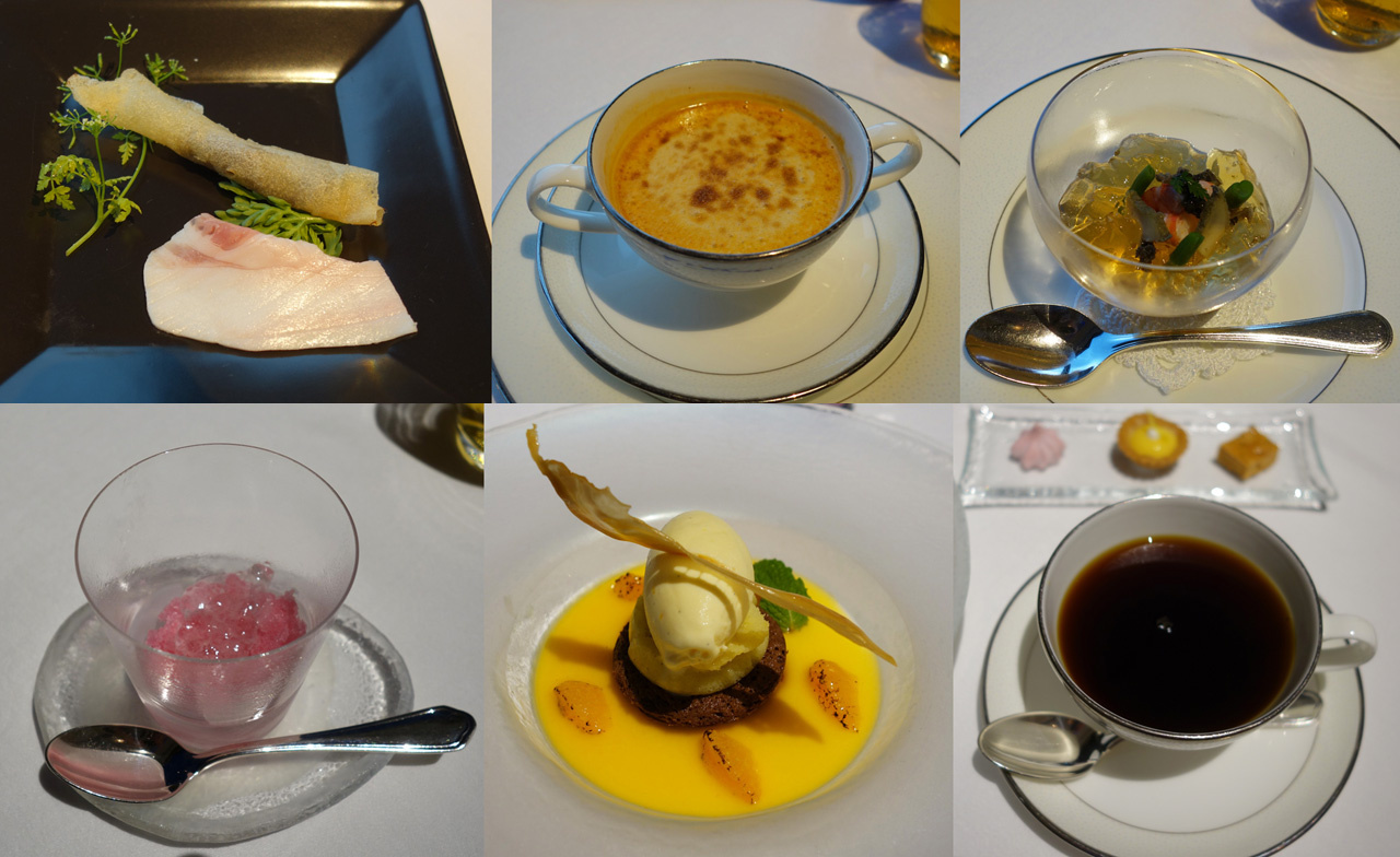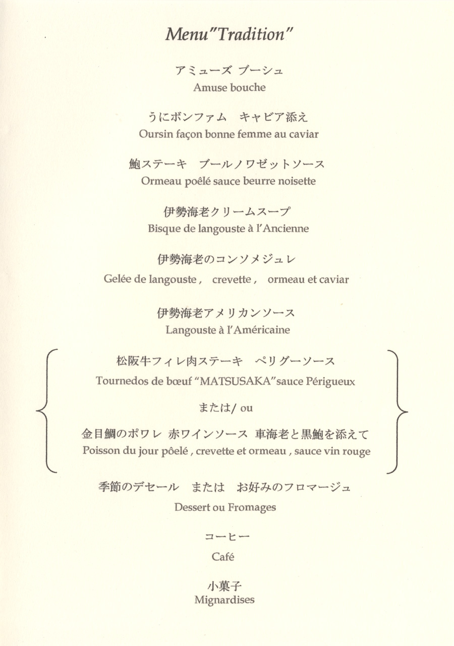 これは主要料理である、「鮑ステーキ ブールノアゼットソース」、「伊勢海老アメリカンソース」、「松阪牛フィレ肉ステーキ ペリグーソース」です。いずれも美味しくて堪能できました。