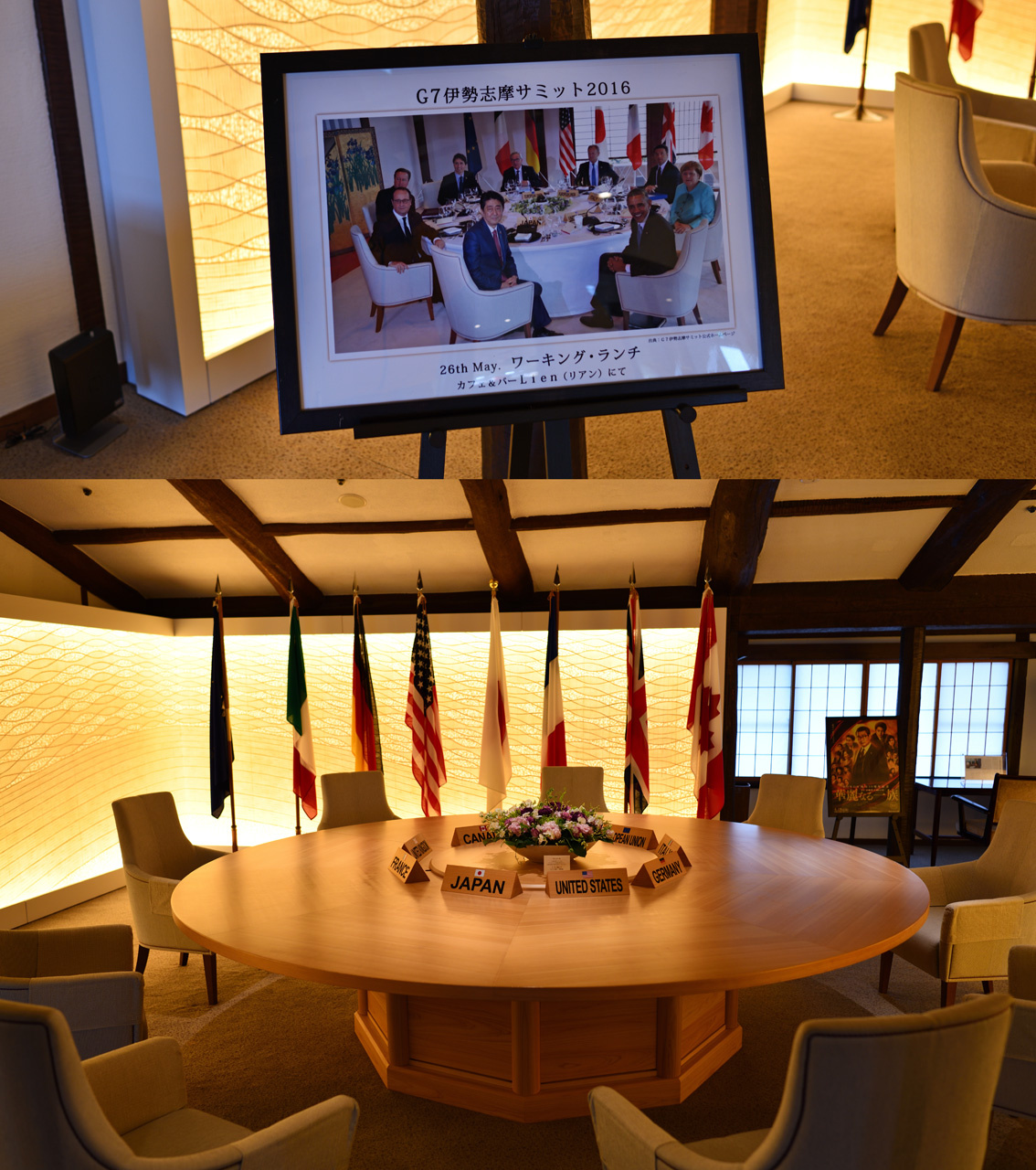 写真はサミットのワーキング・ランチで使用した丸テーブル。こういう丸テーブルが3個あったそうです。