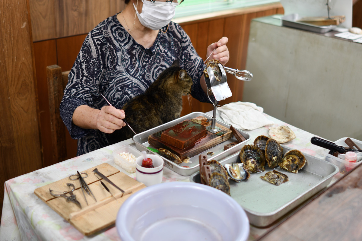 真珠モデル工場で挿核手術の作業を見学しました。
