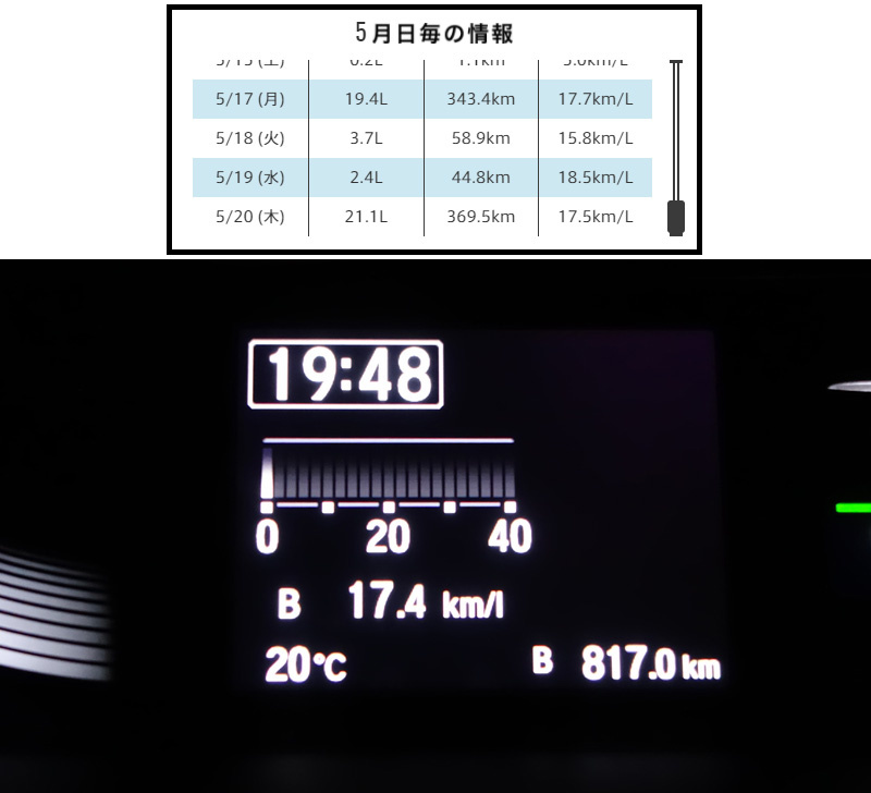 今回は817Km走って燃費は17.4Km/lでした。Honda Total Careの記録とも合っているようです。
