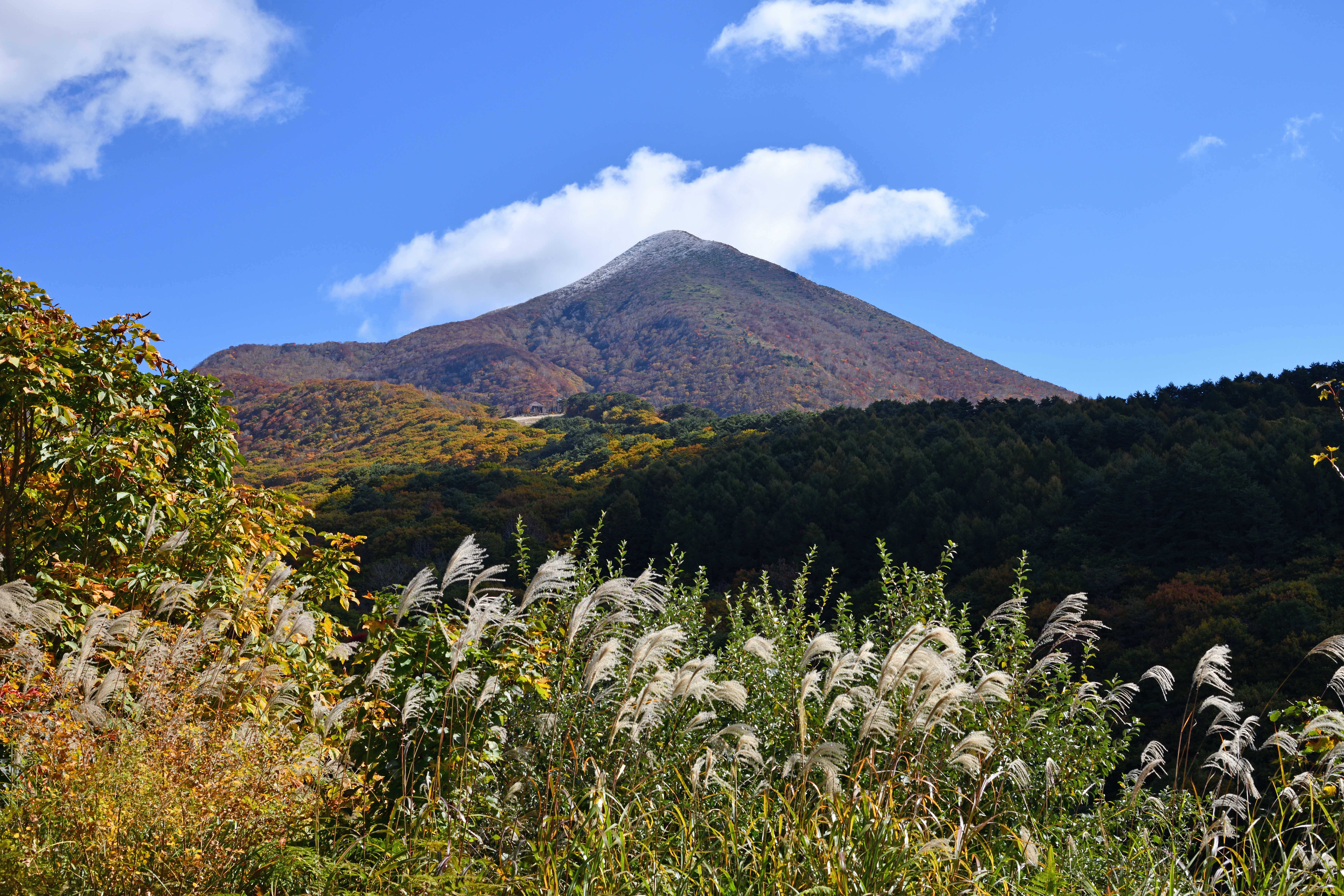少し進んだところでは磐梯山がよく見えました。ここはもう磐梯山の中腹です。頂上付近が初冠雪のようでした。望遠で撮った写真には頂上付近に登山者が写ってました。