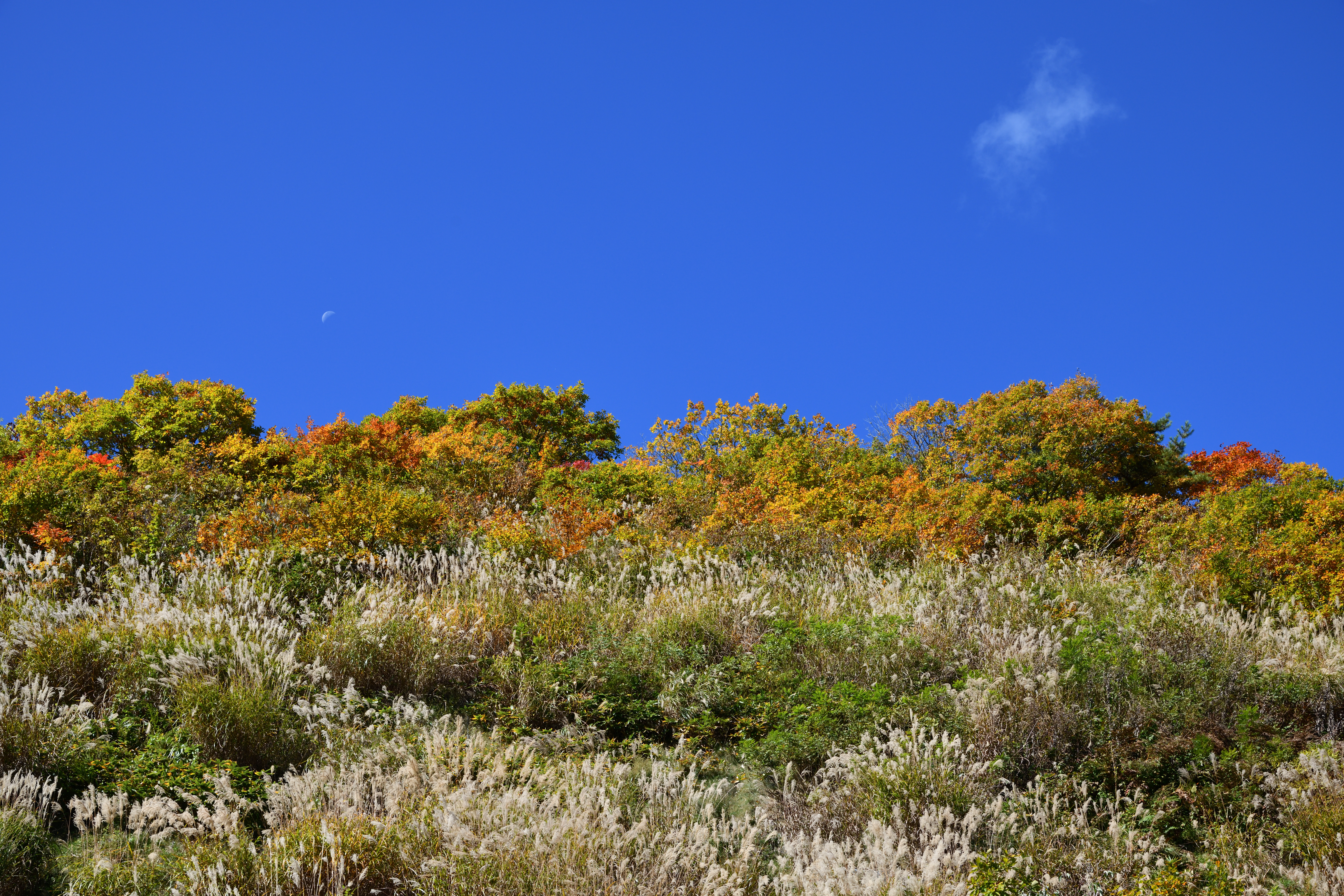 山側を見ると既に紅葉が綺麗です。月がチラッと見えています。