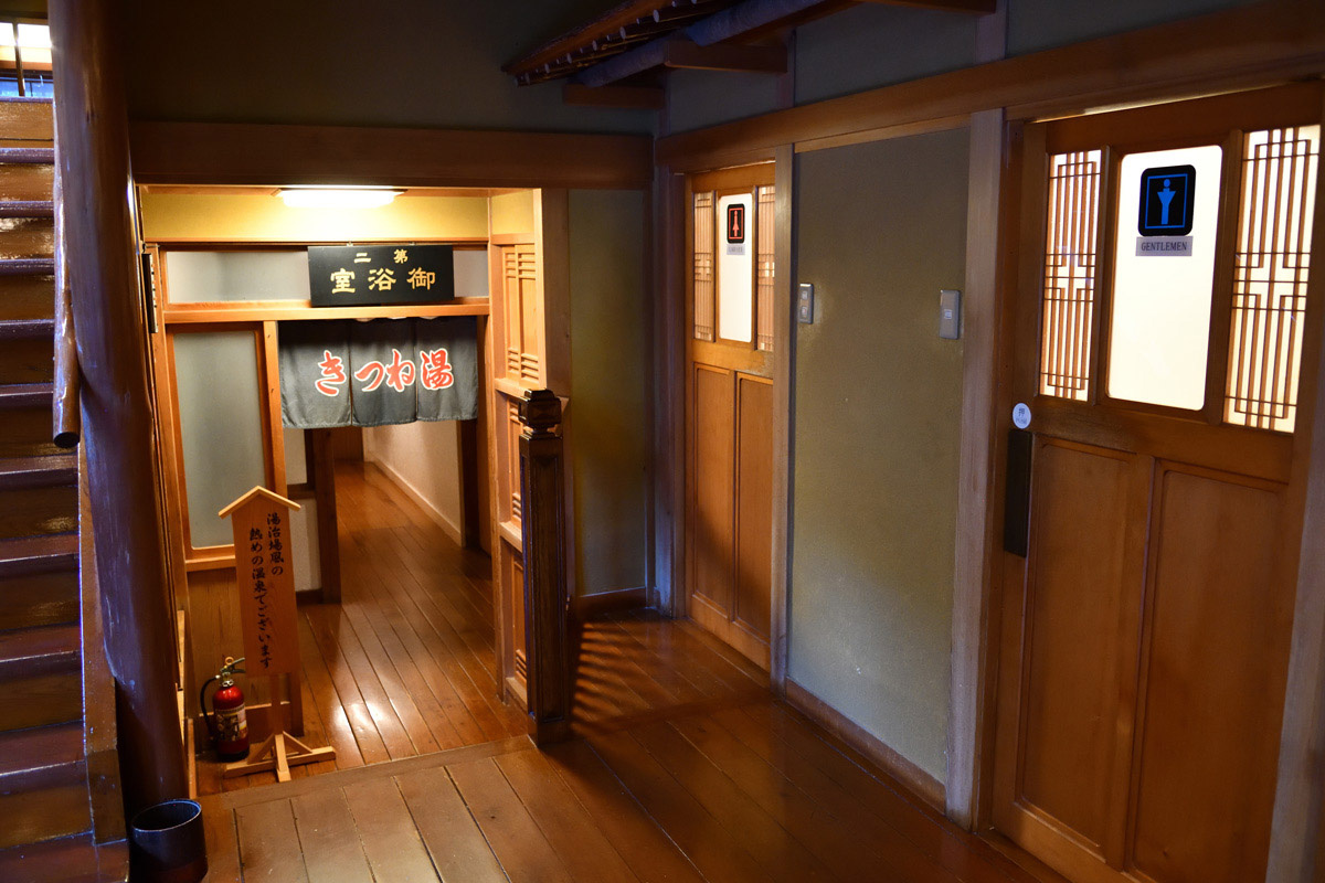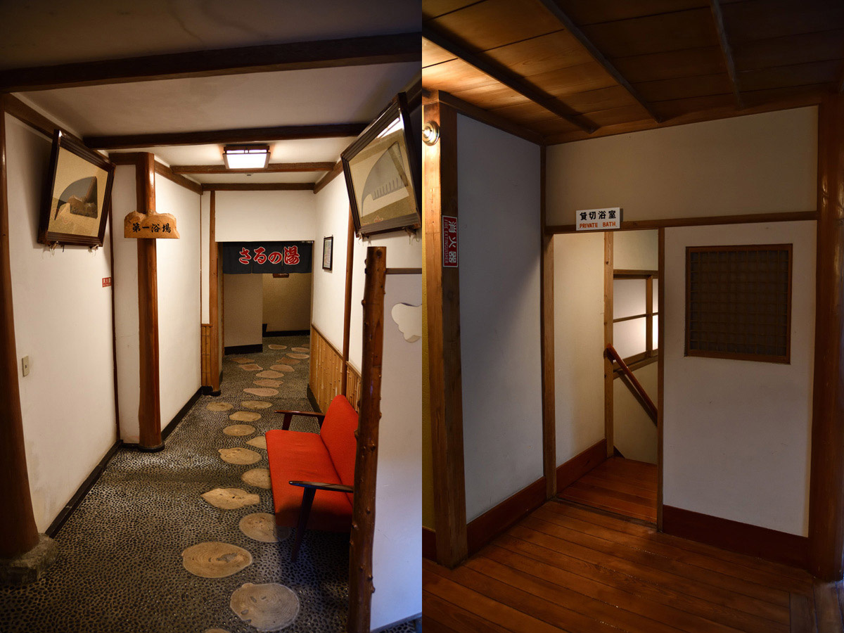 向瀧には3種類の風呂があります。全て源泉かけ流し。左が1番大きな「さるの湯」で、ここはシャワー等の洗い場が充実しているがややぬるめ。右の「貸し切り風呂」は小さいのが3部屋あって空いていれば自由に入浴できます(中から鍵をかける)。貸し切り風呂と次の「きつね湯」は従来の湯治スタイルなのでシャワー等はありません。「貸し切り風呂」はやや熱め。