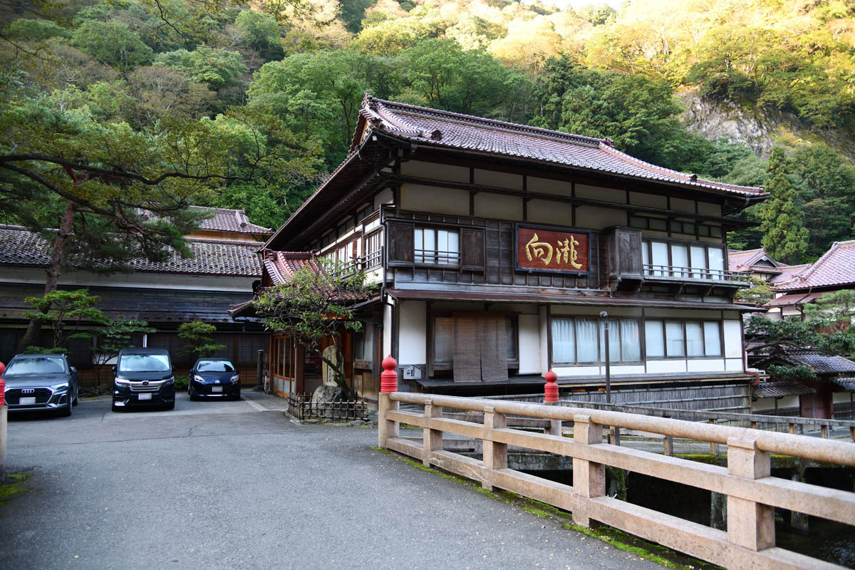 向瀧は山の麓を庭にして、これを取り囲むように建物があるので階段だらけです。右側奥には60段の階段が続いています。