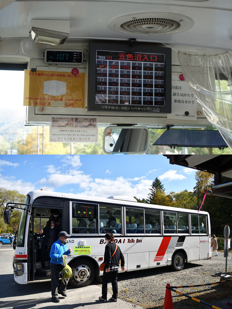 裏磐梯物産館の駐車場にクルマを駐め、13:00にバスに乗ると13:07に東側の五色沼入口バス停に着きます。そこから4Kmの五色沼自然探勝路を歩いて戻ります。
