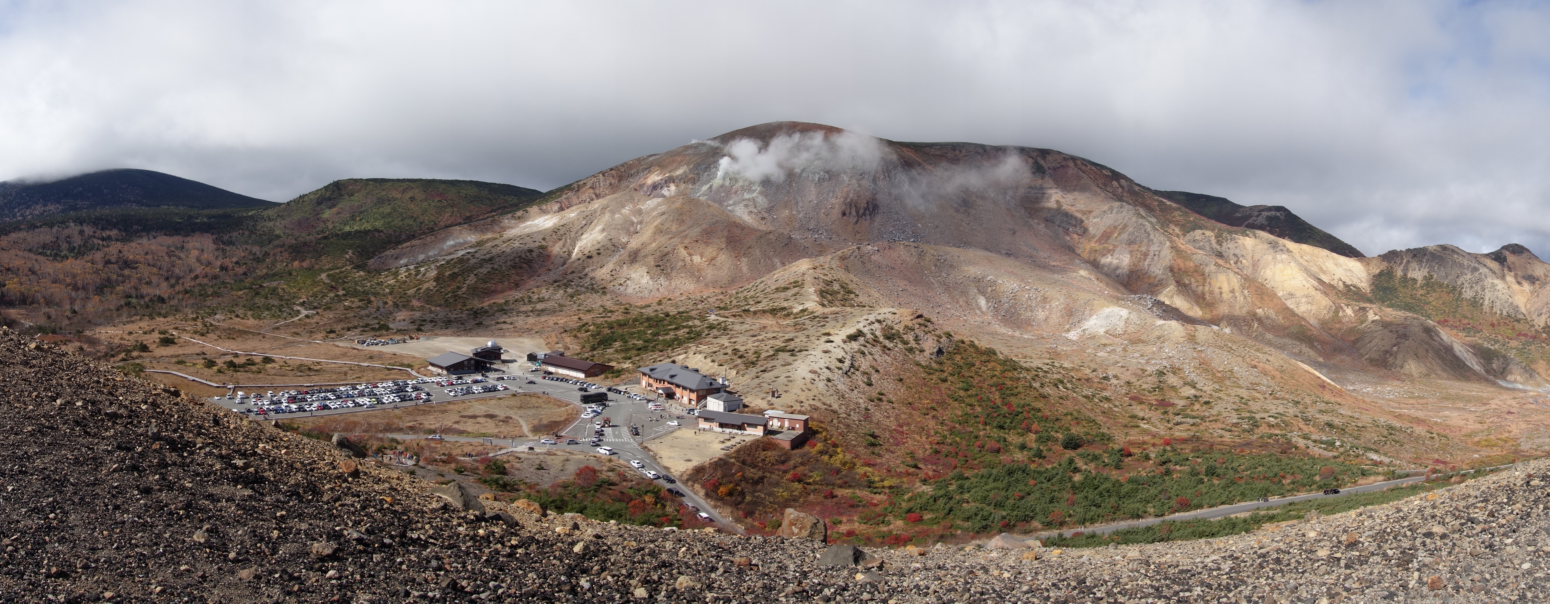 駐車場側を見下ろしたパノラマ写真。山の中腹で噴煙が上がっていてまさに活火山です。
