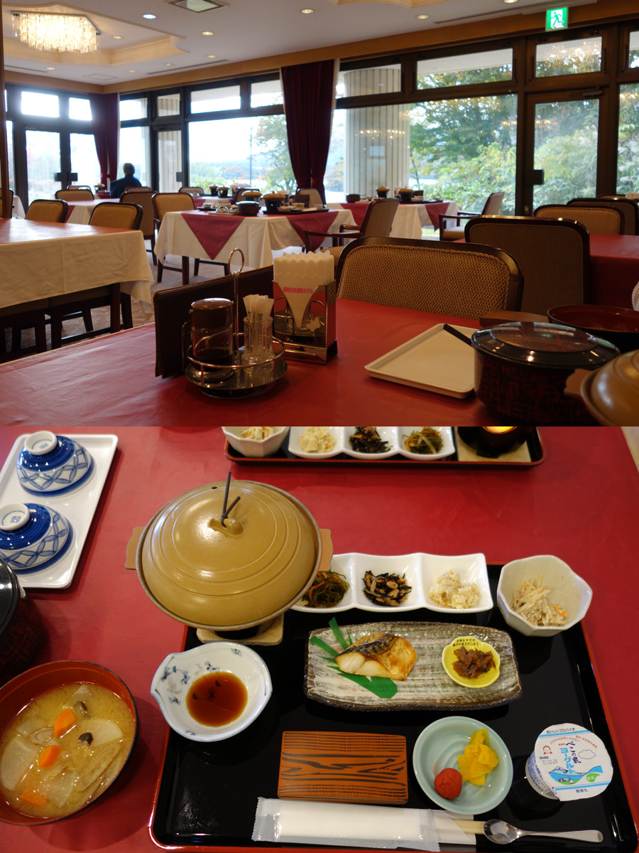 朝食と磐梯檜原湖畔ホテルのレストランです。昼間の窓際は眺めが良いです。