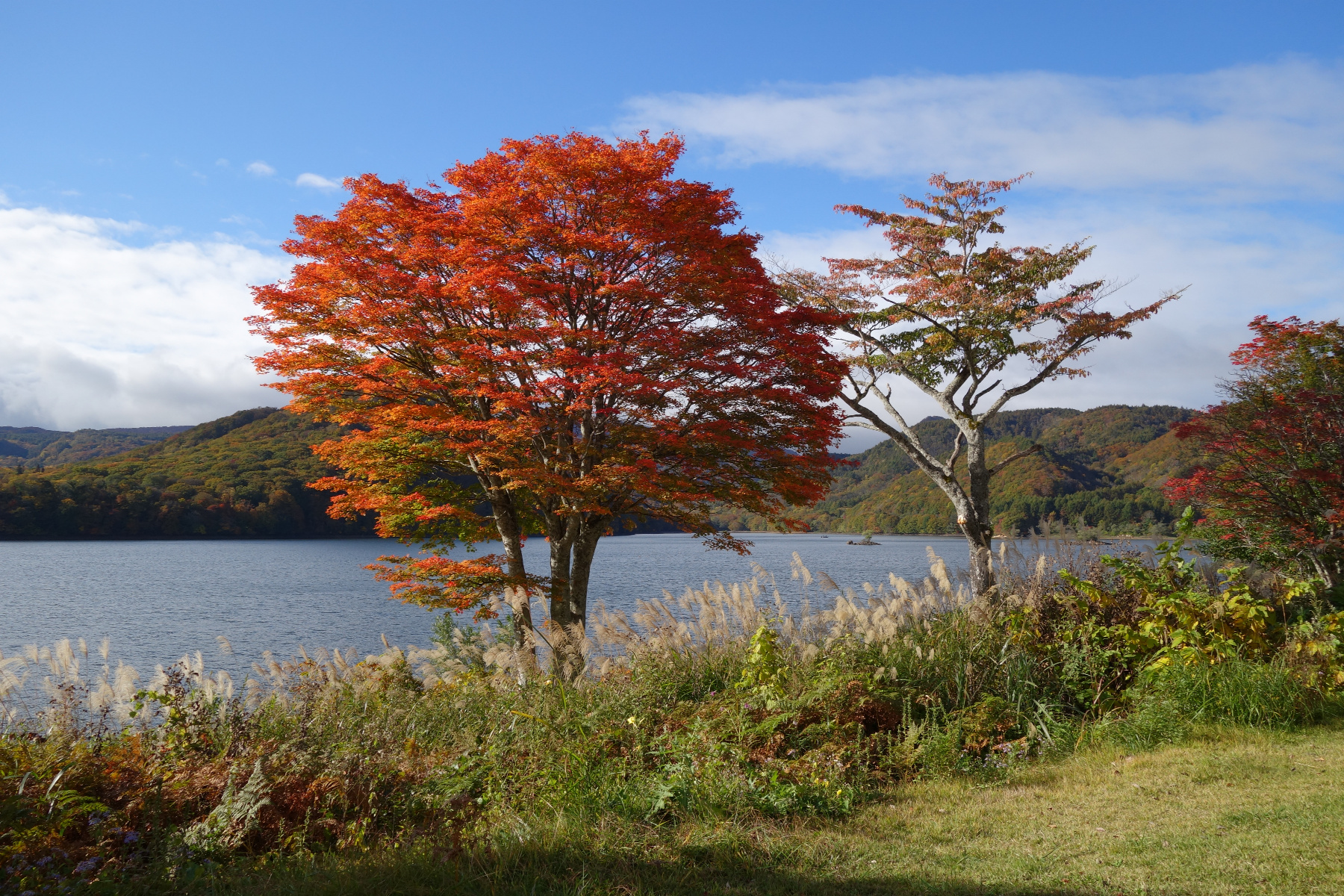 時間があるのでホテルの外を散策。駐車場の回りも紅葉が綺麗です。ゲートを抜けると湖に面した庭に出られます。