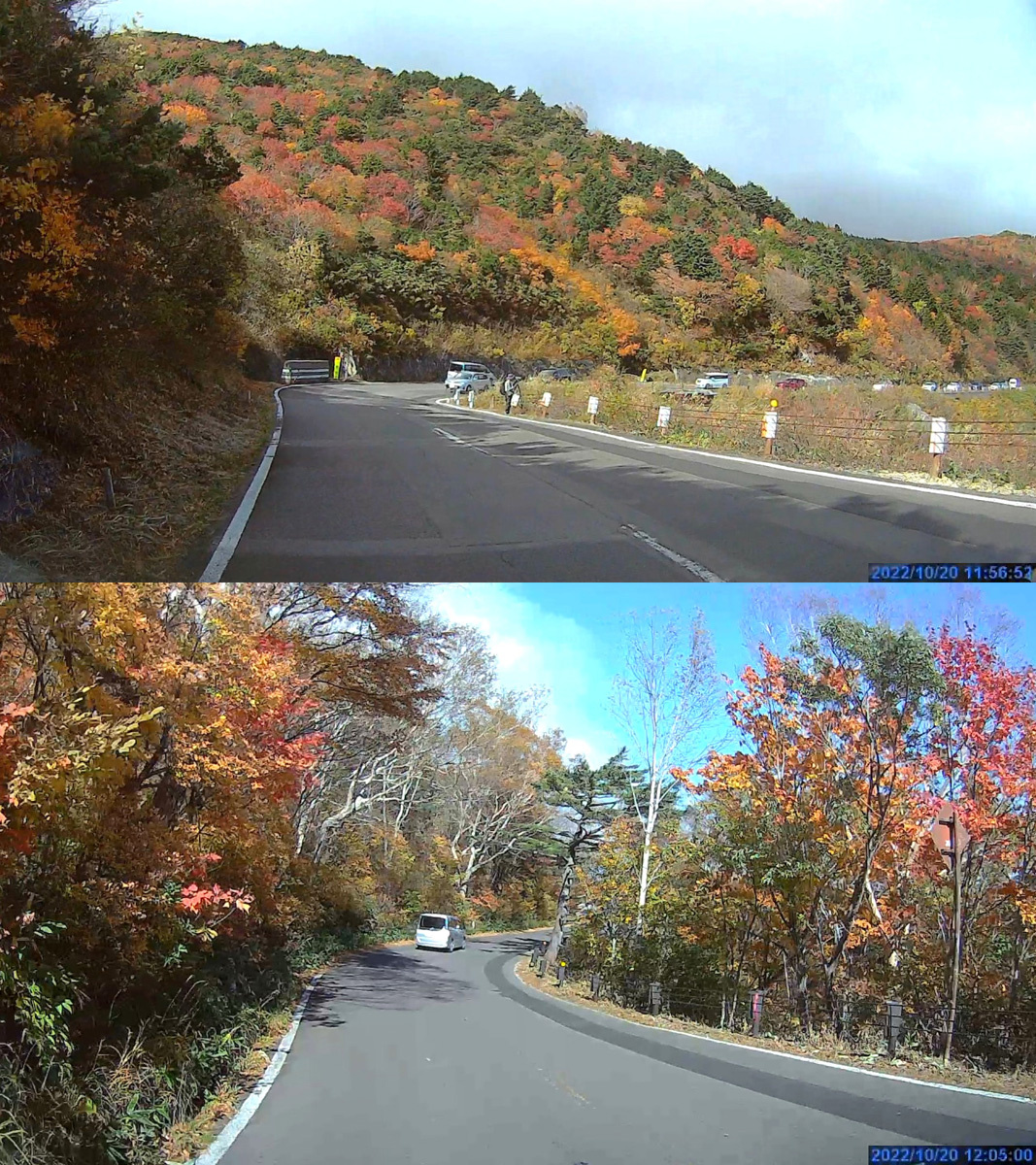 危険地帯を抜けると再び綺麗な紅葉の中を下って行きます。Sモードに切り替えエンジンブレーキならぬ回生ブレーキを動作させながら下りました。バッテリーの表示は常にフル充電状態だったが大丈夫なのかな?。
