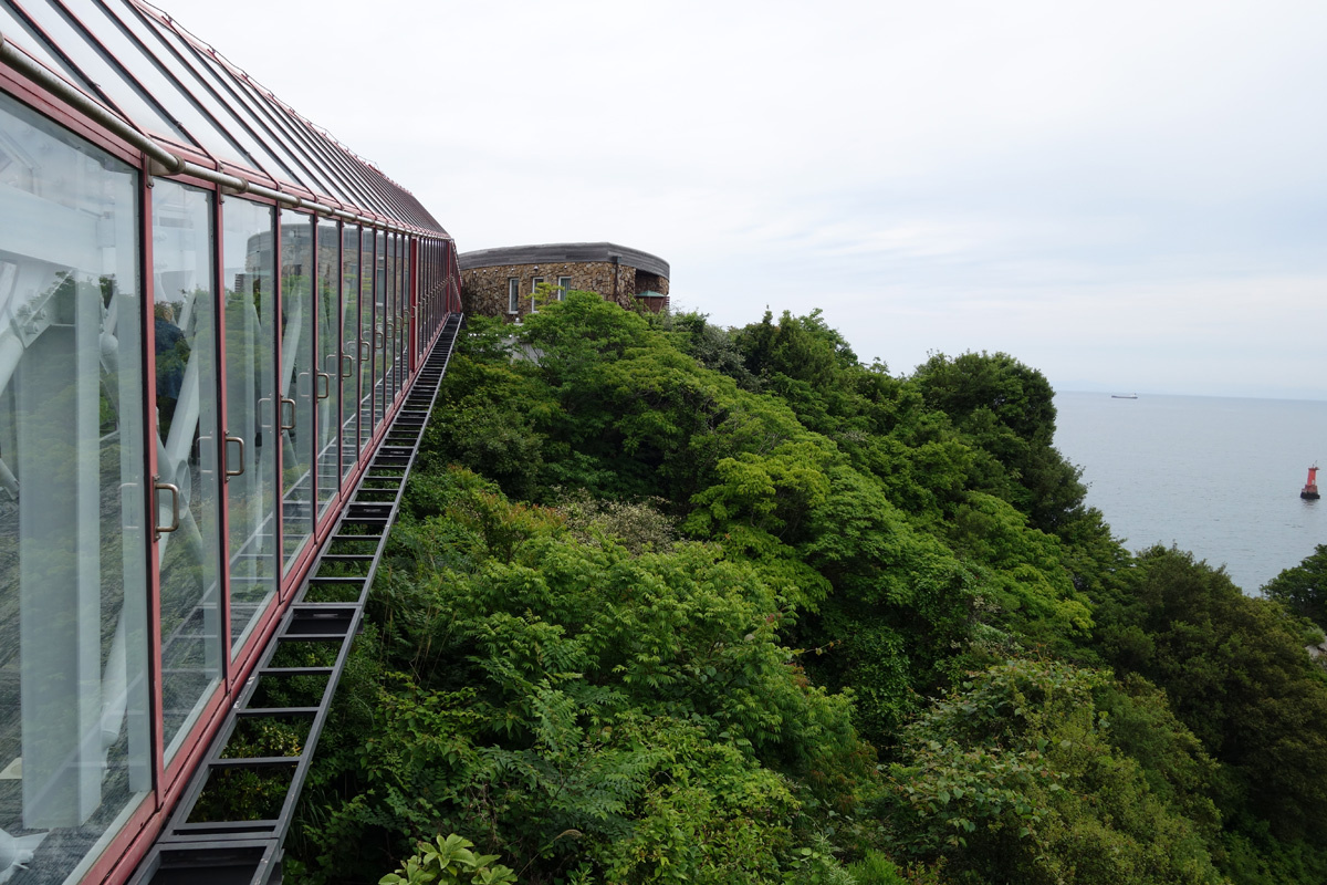 断崖の上のレストラン「ペティイゾラ」へはこの渡り廊下を通って行きます。
