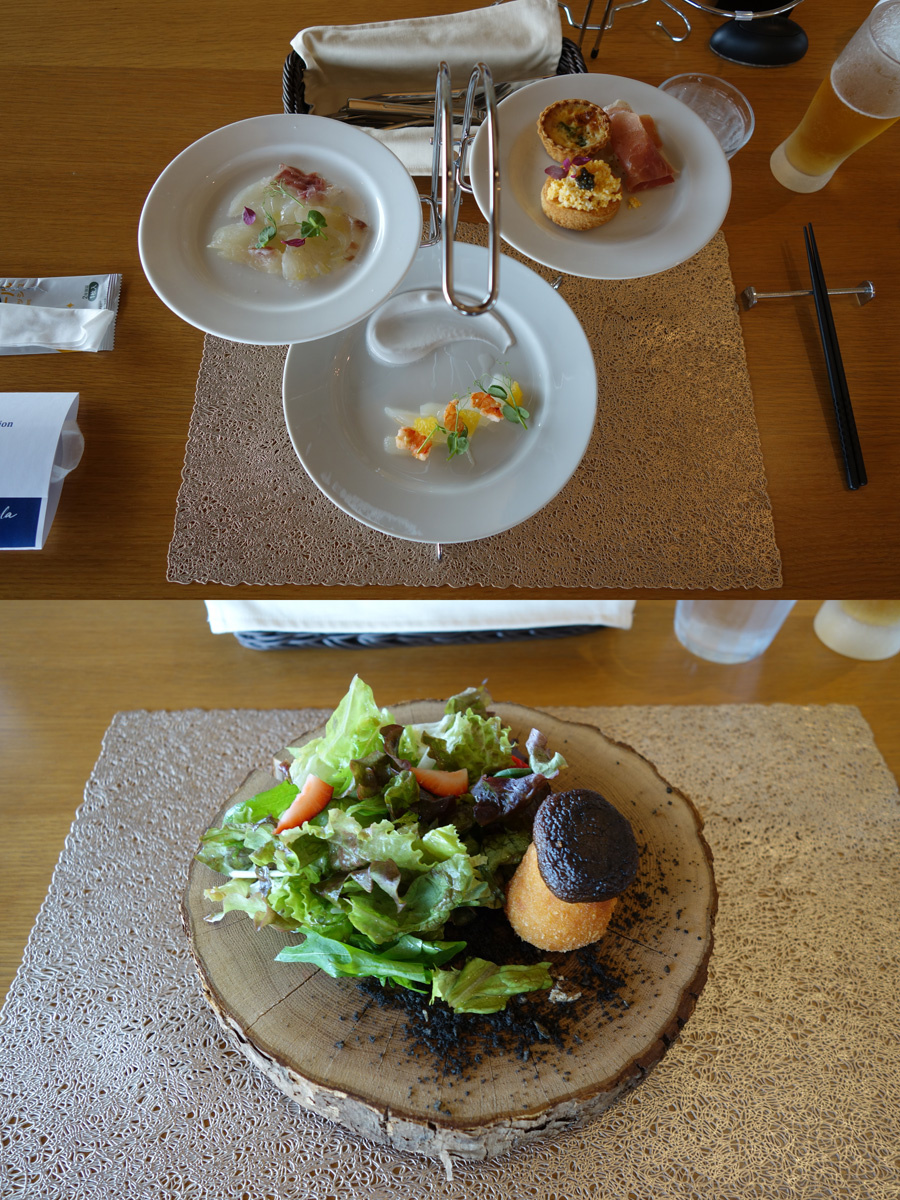 これは前菜とサラダですが皿が3枚アフタヌーンティーみないなスタンドに乗ってます(だからスタンドコースなのか)。しかし結局下に下ろして食べるので別々に持ってきても良い気が・・・。