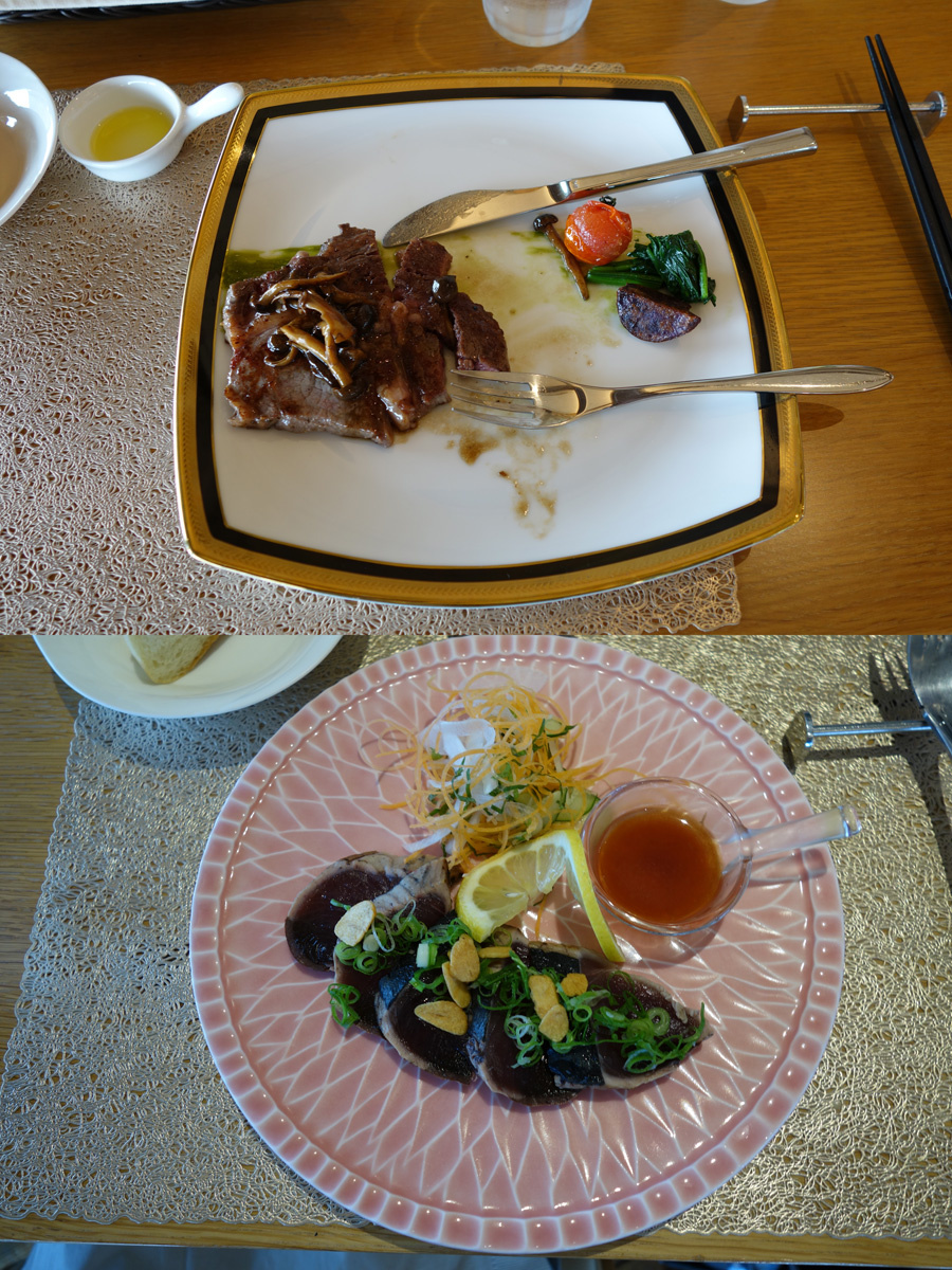 メインは「リブロースステーキ」と「旬のお魚料理」から選べます。上が肉(ちょっと食べてしまったけど)で下が魚です。