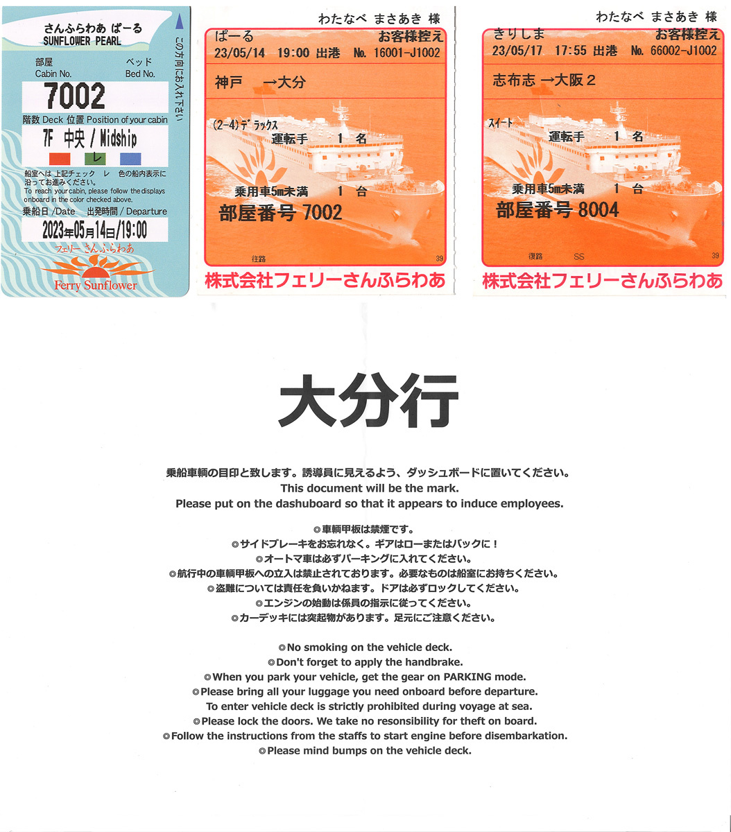 ![]() 乗船券と部屋のカードキーです。右は帰りの乗船券です。帰りはカードキーではなくICカードだったので回収されてしまいました。下はダッシュボードに置いておく行き先の紙です。もう検温も無いので昨年のようなヒヤヒヤもありません。 |