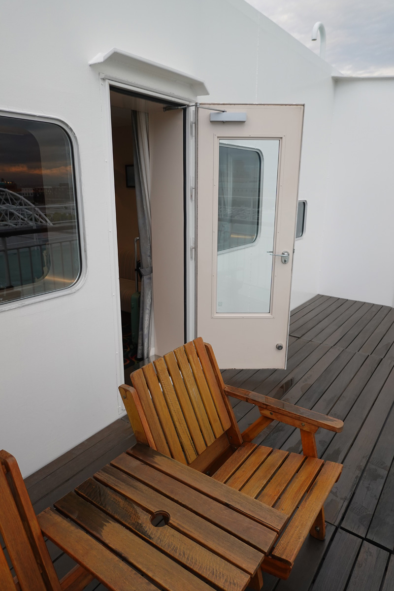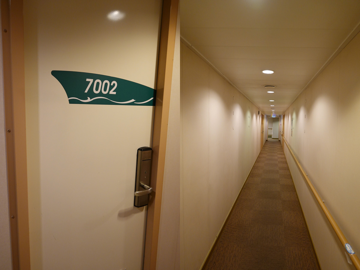![]() 船内を探訪しつつ夕食を食べに行きました。 7002号室のドアと通路。7階はデラックスルームのみです。 |