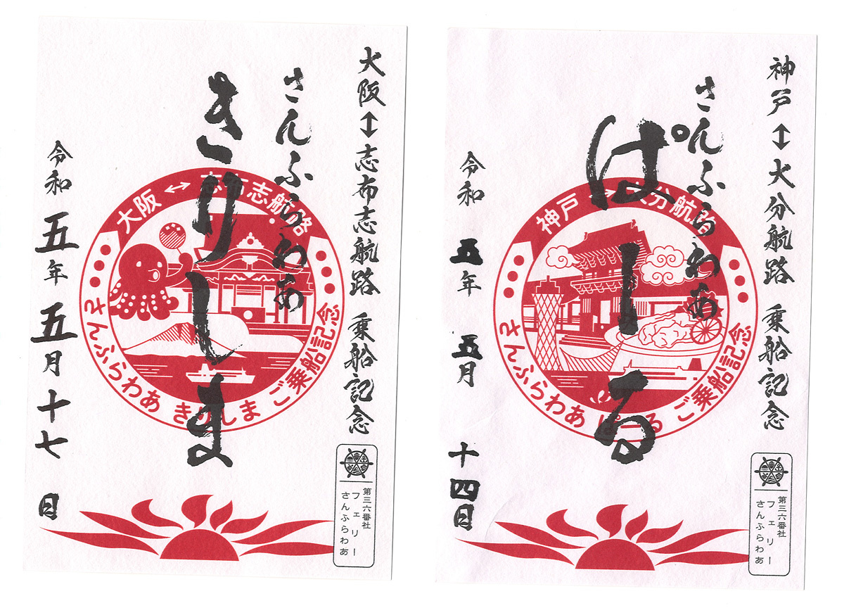 ![]() 「ぱーる」の御船印も購入しました(右)。左は帰りの「きりしま」の御船印です。 |