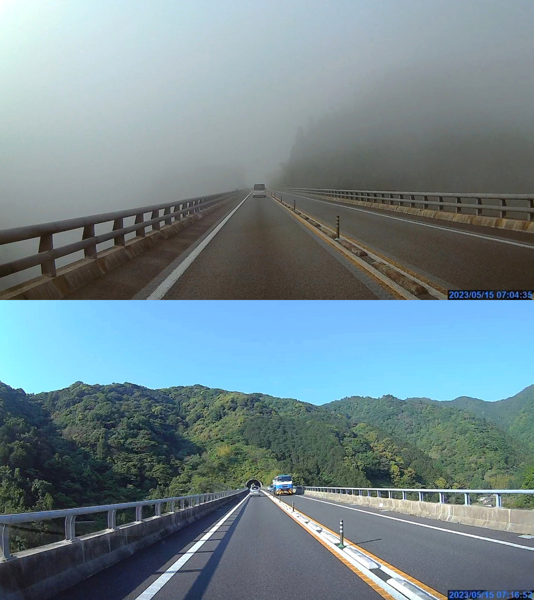 【動画】東九州自動車を大分から宮崎へ霧の中を走りました。 ドラレコ映像からの切出しで4倍速再生(トンネル内20倍速)です。 |