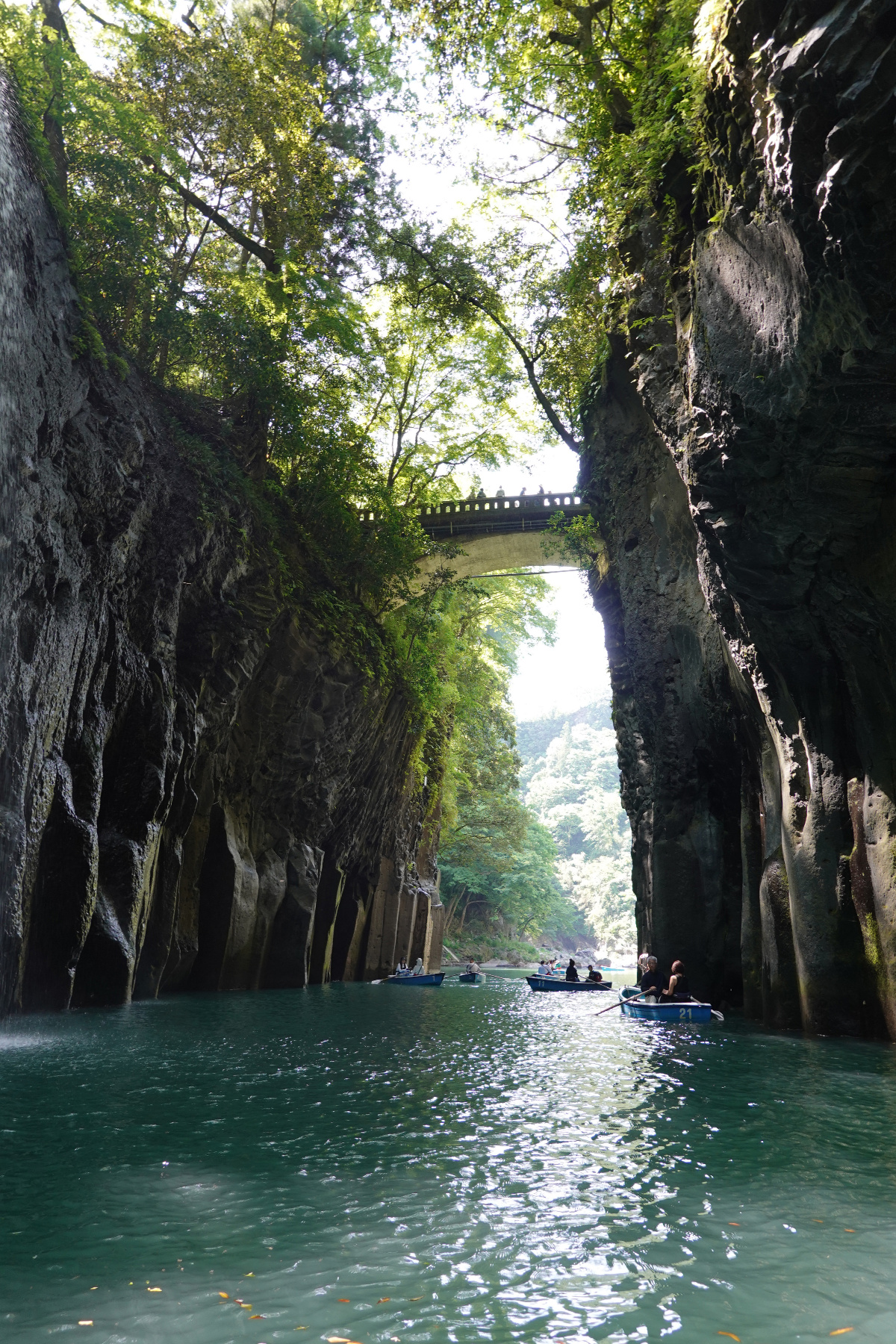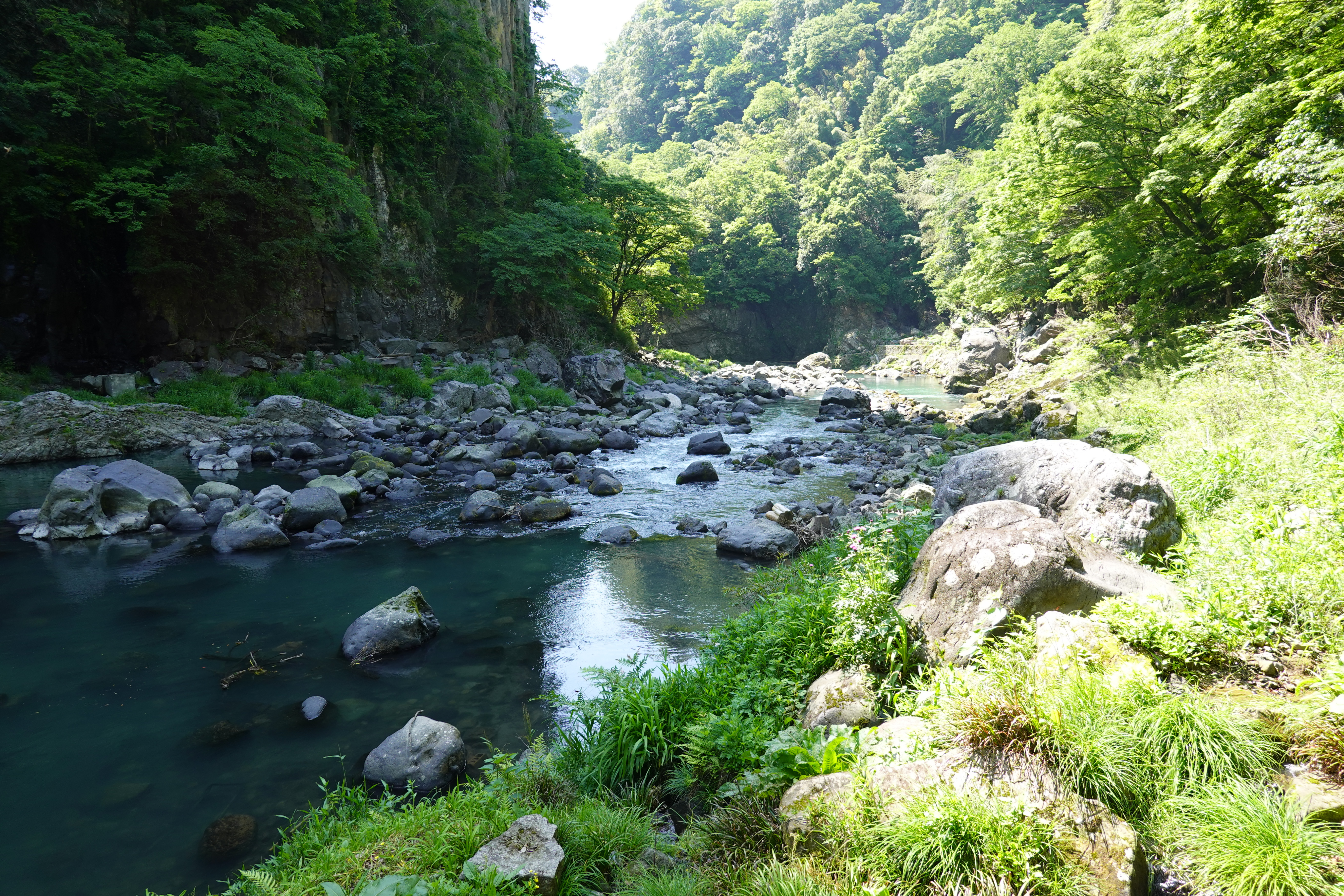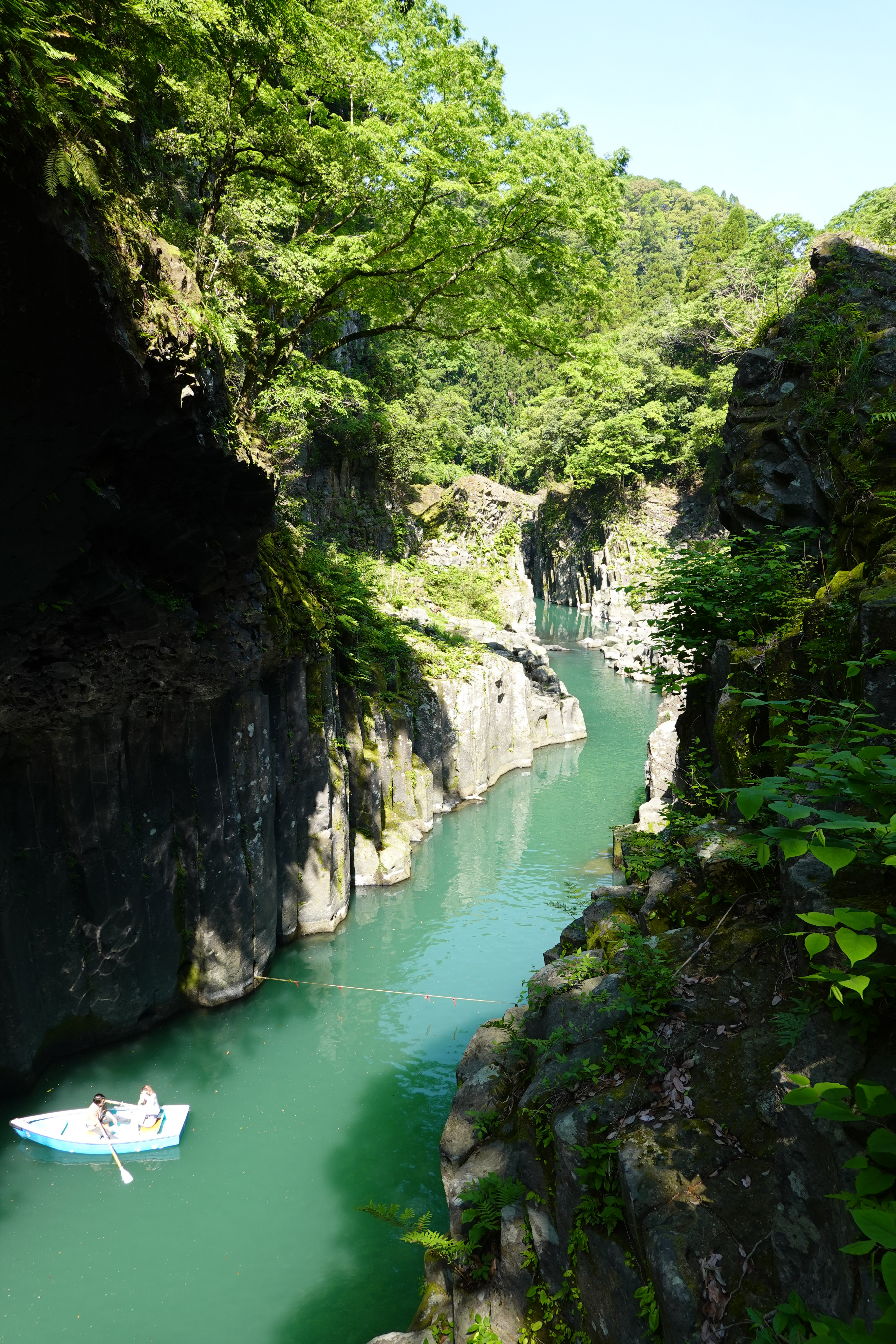 真下の様子。川幅は狭いです。真っ直ぐに切り立った柱状節理が不思議な感じです。これは10万年前の阿蘇山噴火の際に流れ出た火砕流の堆積物だそうです。