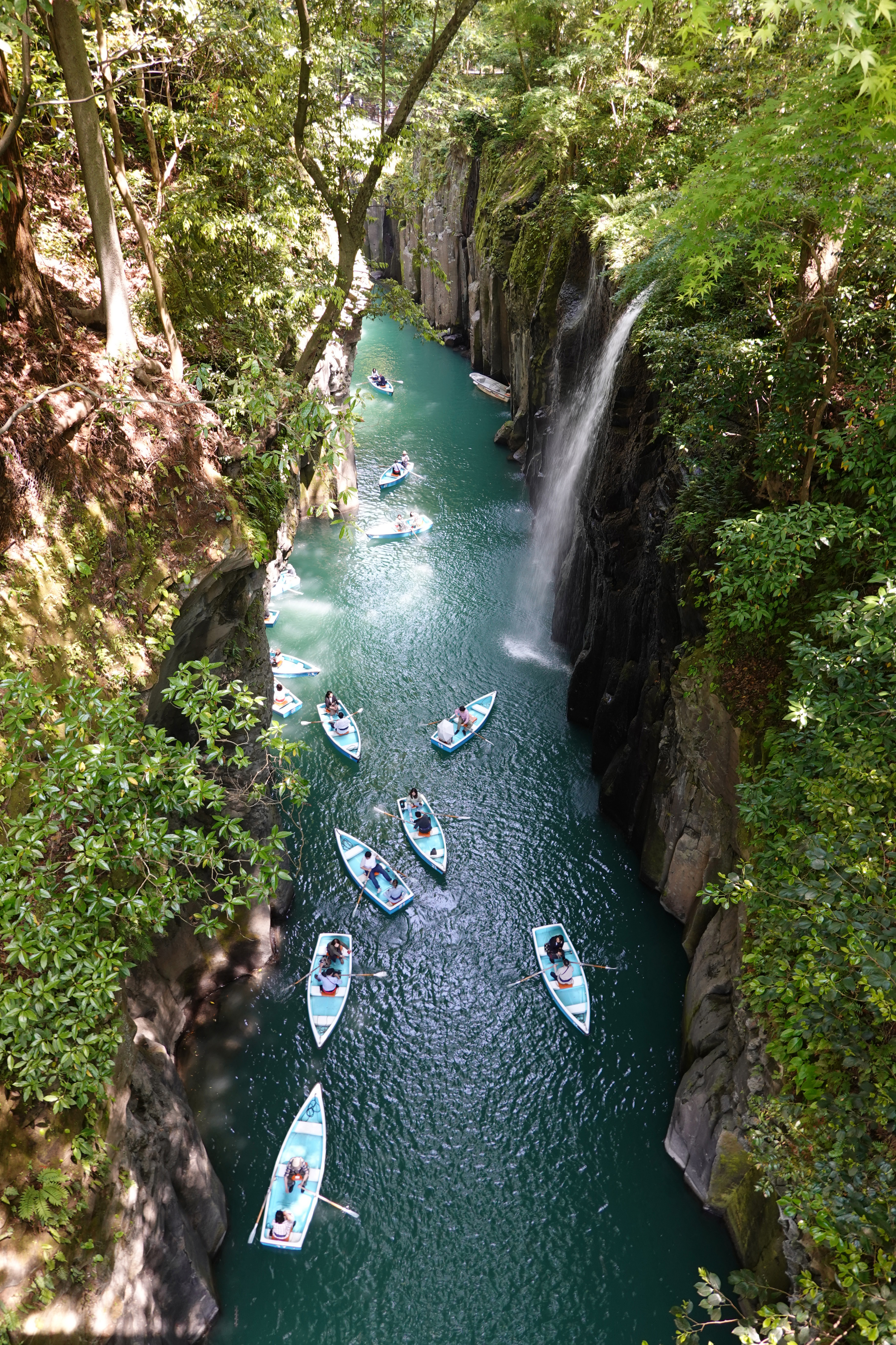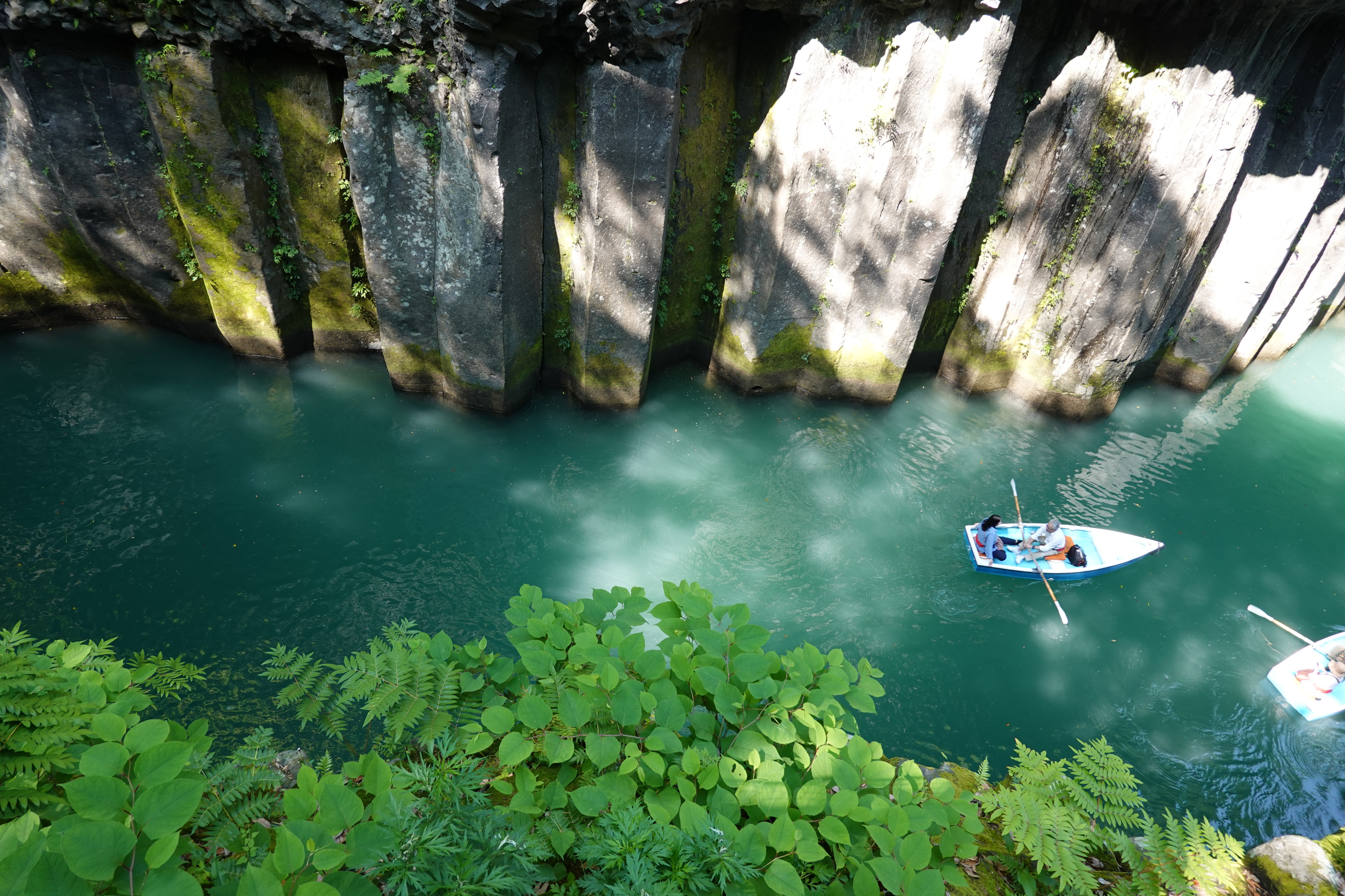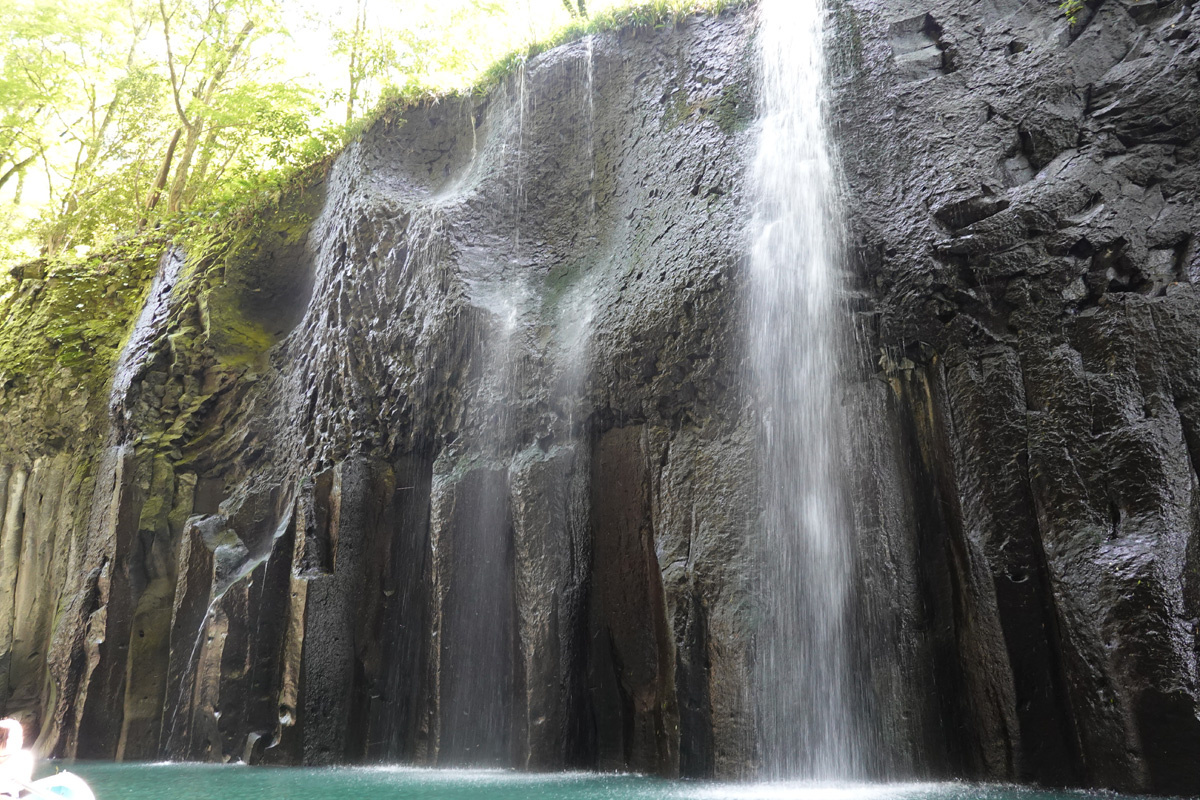 真下の様子。川幅は狭いです。真っ直ぐに切り立った柱状節理が不思議な感じです。これは10万年前の阿蘇山噴火の際に流れ出た火砕流の堆積物だそうです。