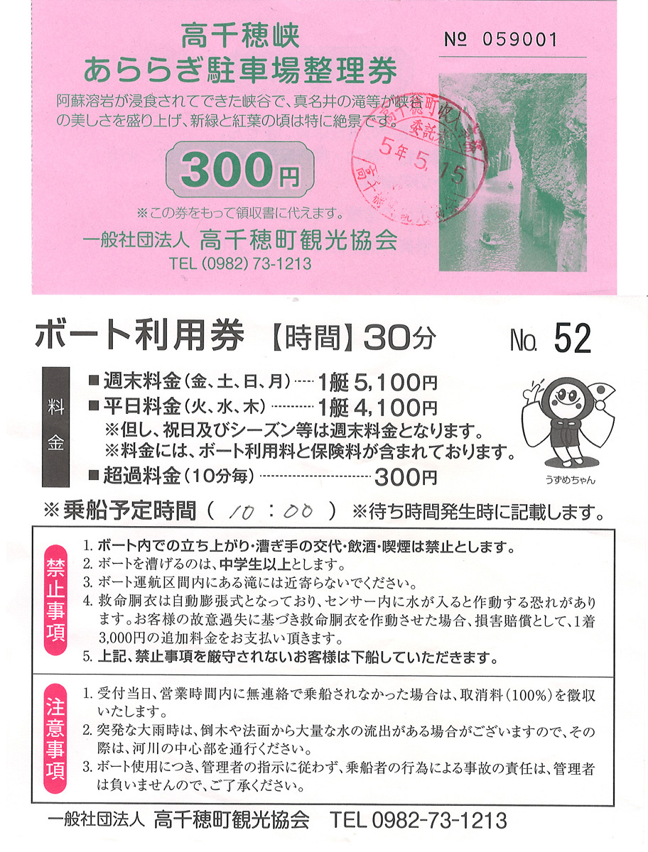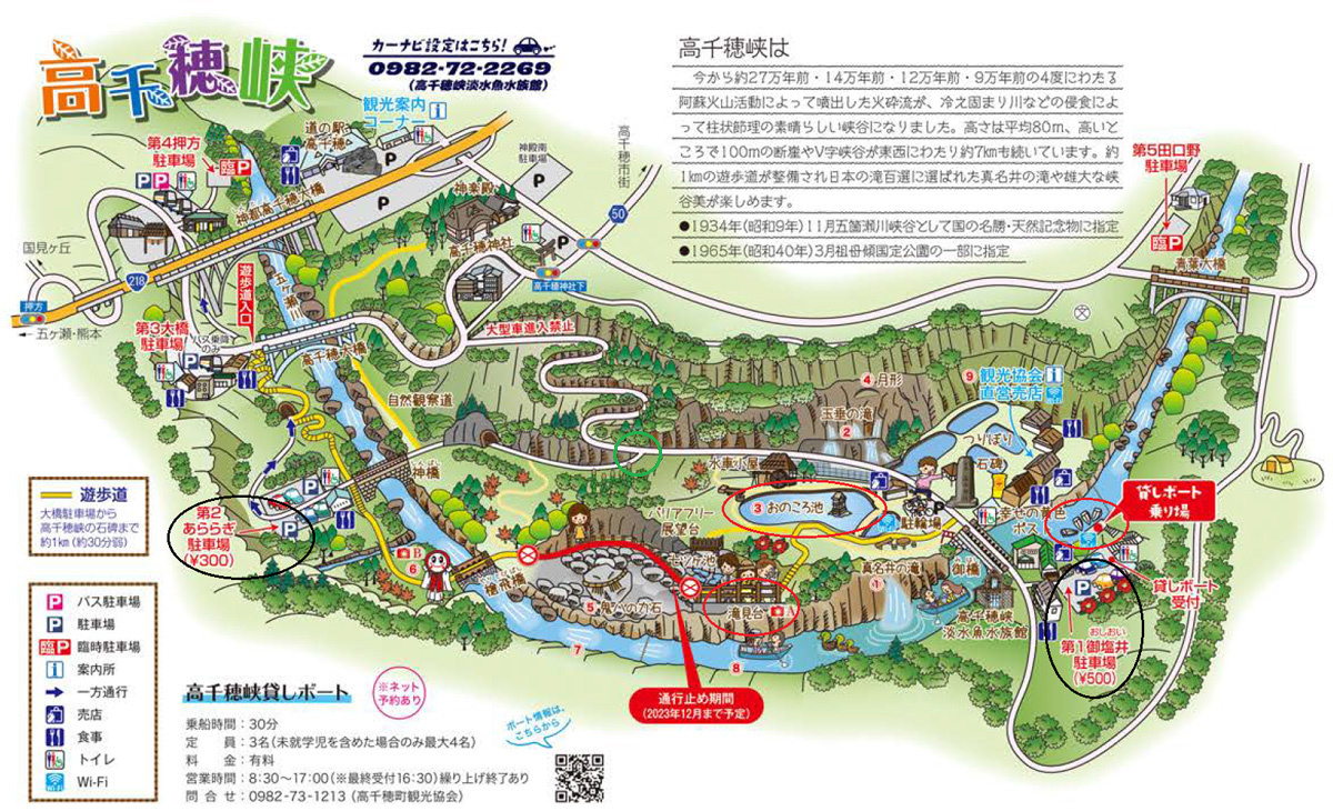 高千穂峡マップです。中央緑丸が2箇所の駐車場への分岐点。右赤丸がボート乗り場で黒で囲んだ第1御塩井駐車場に駐めようと思ってました。
