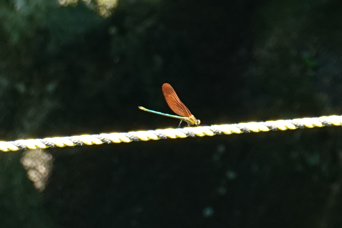 一番奥の進入禁止のロープ付近には綺麗なトンボが沢山飛んでました。ロープに止まっているところを望遠で撮影。