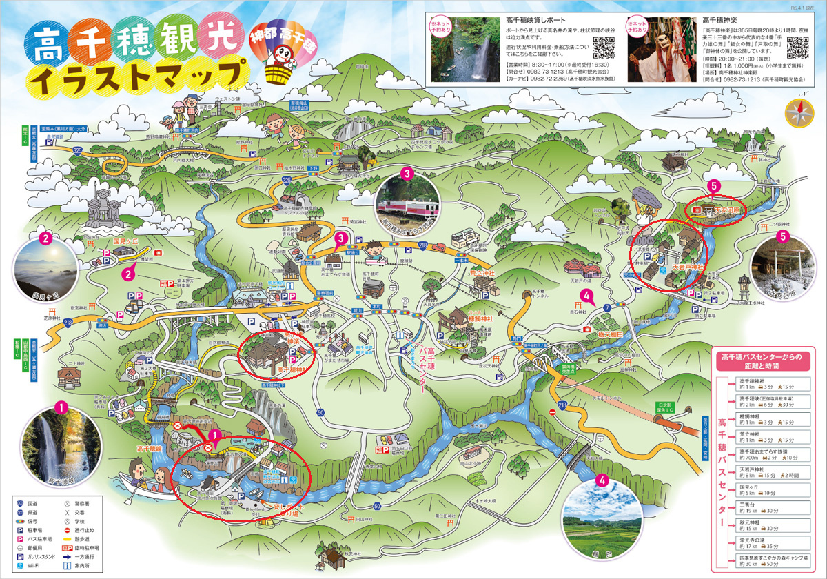 高千穂の広域マップです。左下の大きな赤丸が高千穂峡。これからその上の高千穂神社へ、そして右上の天岩戸神社と天安河原へ向かいます。