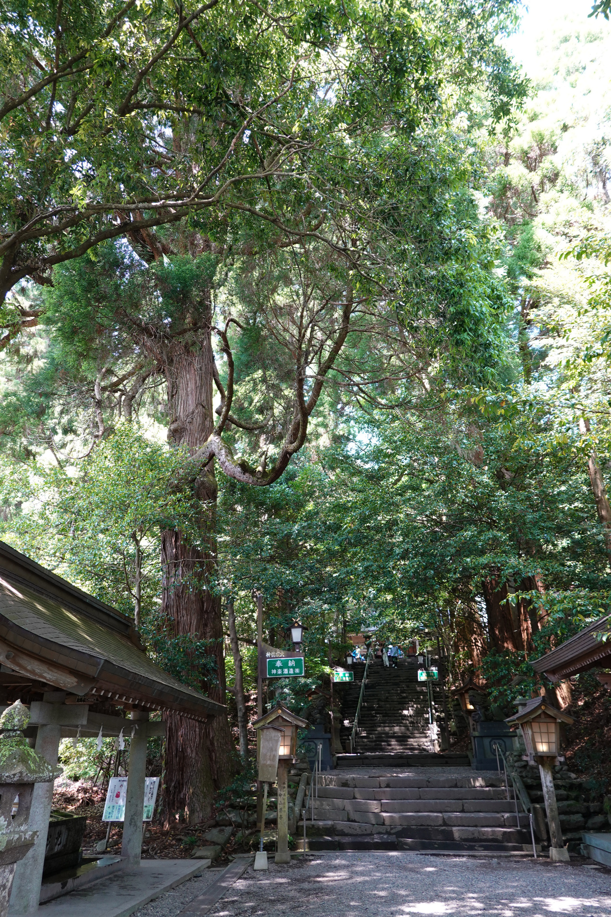 本殿まで長い階段を登って行く正統派の神社です。高い木々に覆われています。