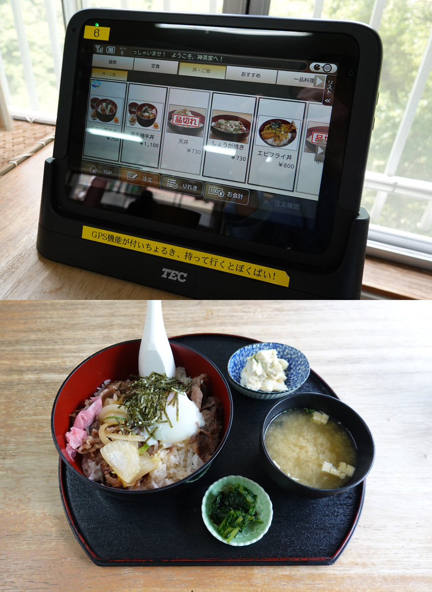 12時近くになっていたので神社に行く前に腹ごしらえです。駐車場近くに手頃な食堂があったので、そこで高千穂牛丼を食べました。タブレットでの発注システムはコロナ禍の中で普及したのでしょうね。