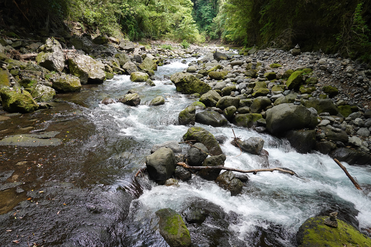 天安河原前の渓流。増水した時には石塔も流されてしまうのかも。