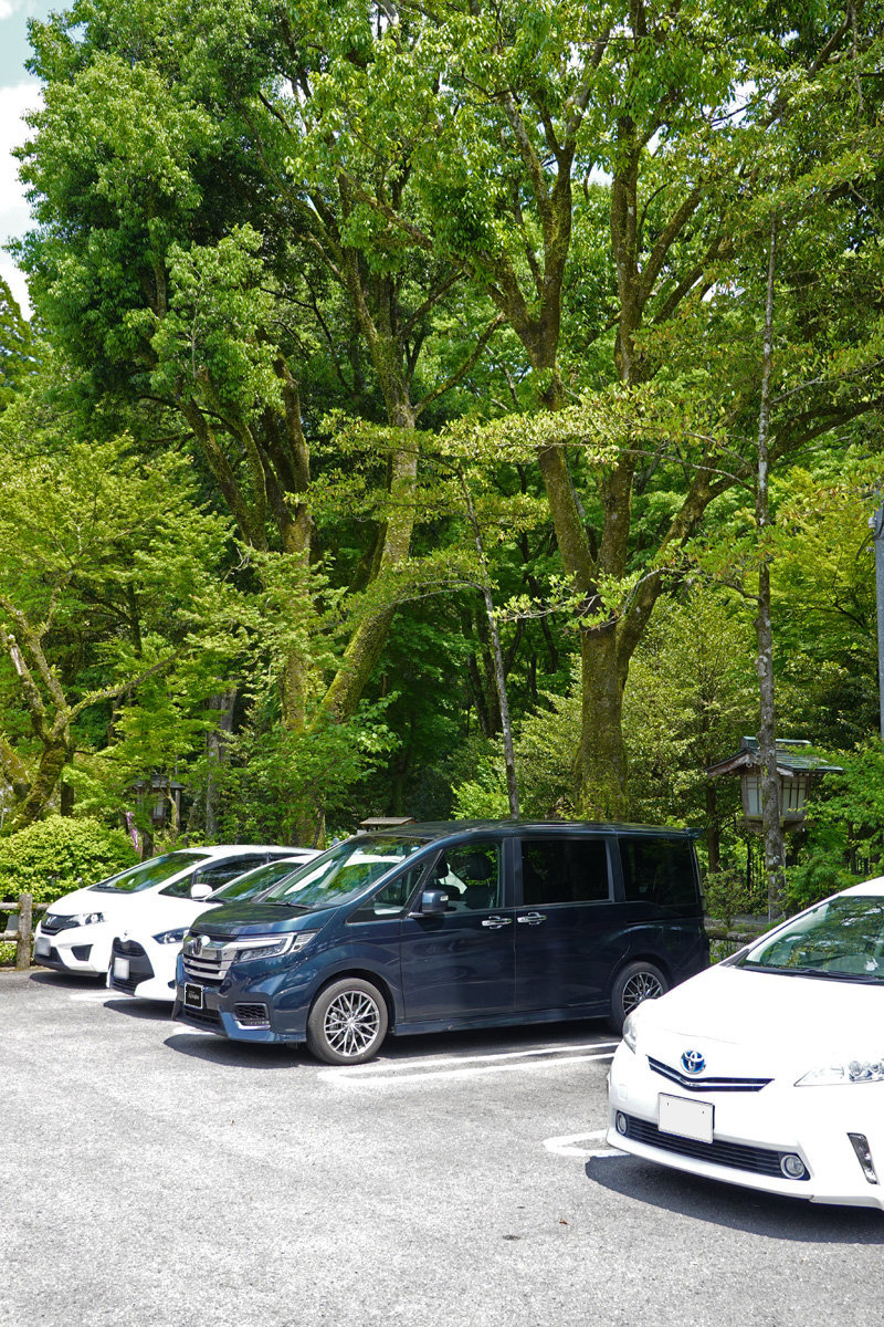 次は天岩戸神社です。ここも無料なんですが駐車場の管理をしている係の人が有能でした。「あそこの赤いワゴン車の隣が2台分空いているのでそこに駐めて下さい」と適切な指示をしてくれます。また通りがかった観光客への親切な案内もしているようでした。