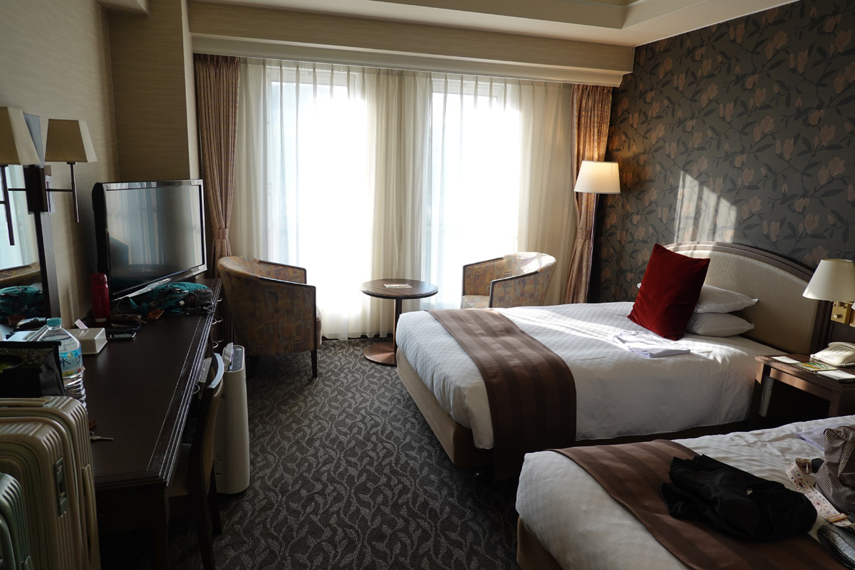 部屋はまあ一般的なホテルの部屋でした。キャッスルビューで熊本城が見えるのですが、汚れた窓ガラスに西日が当たり綺麗に見えません。お城の写真は明日朝に。