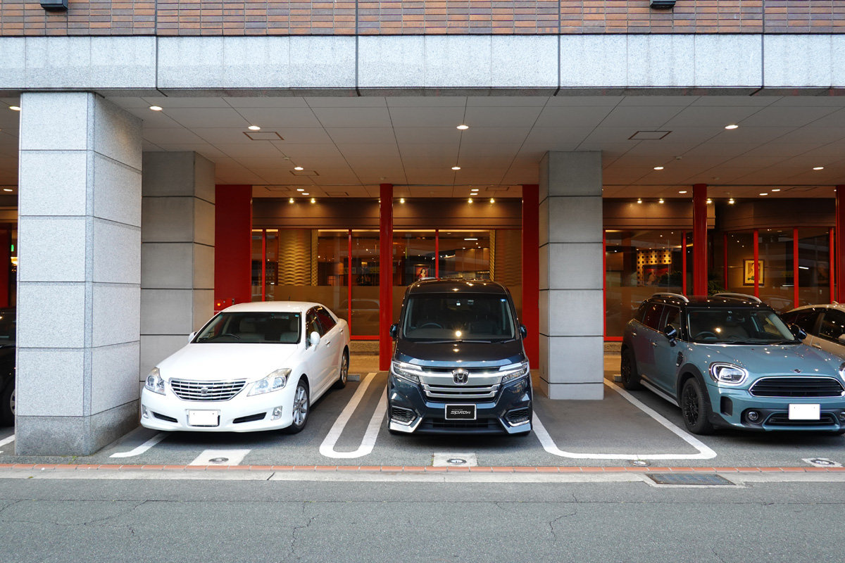立体駐車場は大きなクルマは入れないそうでホテル周囲の平置き駐車場に案内されました。