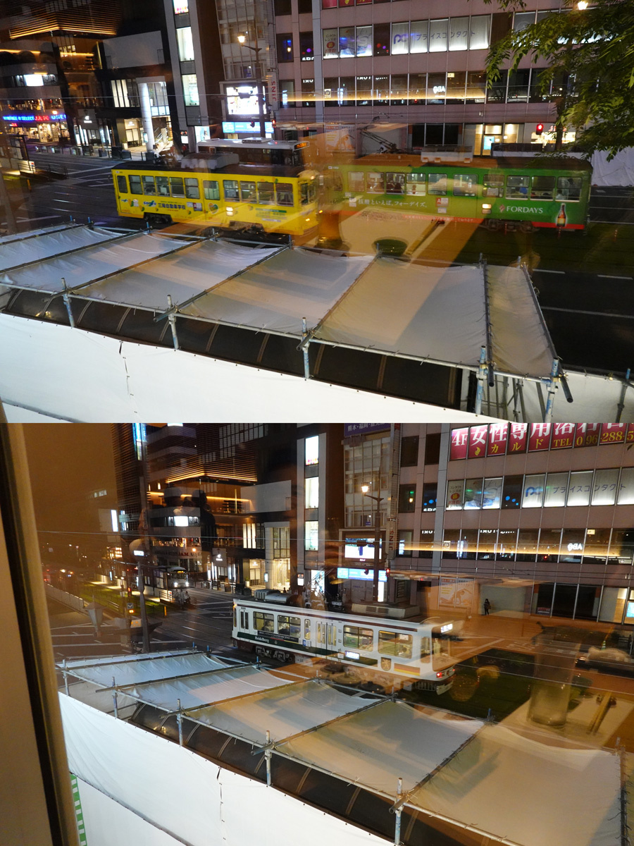 食事中に目の前を色々な色の路面電車が走って行きました。