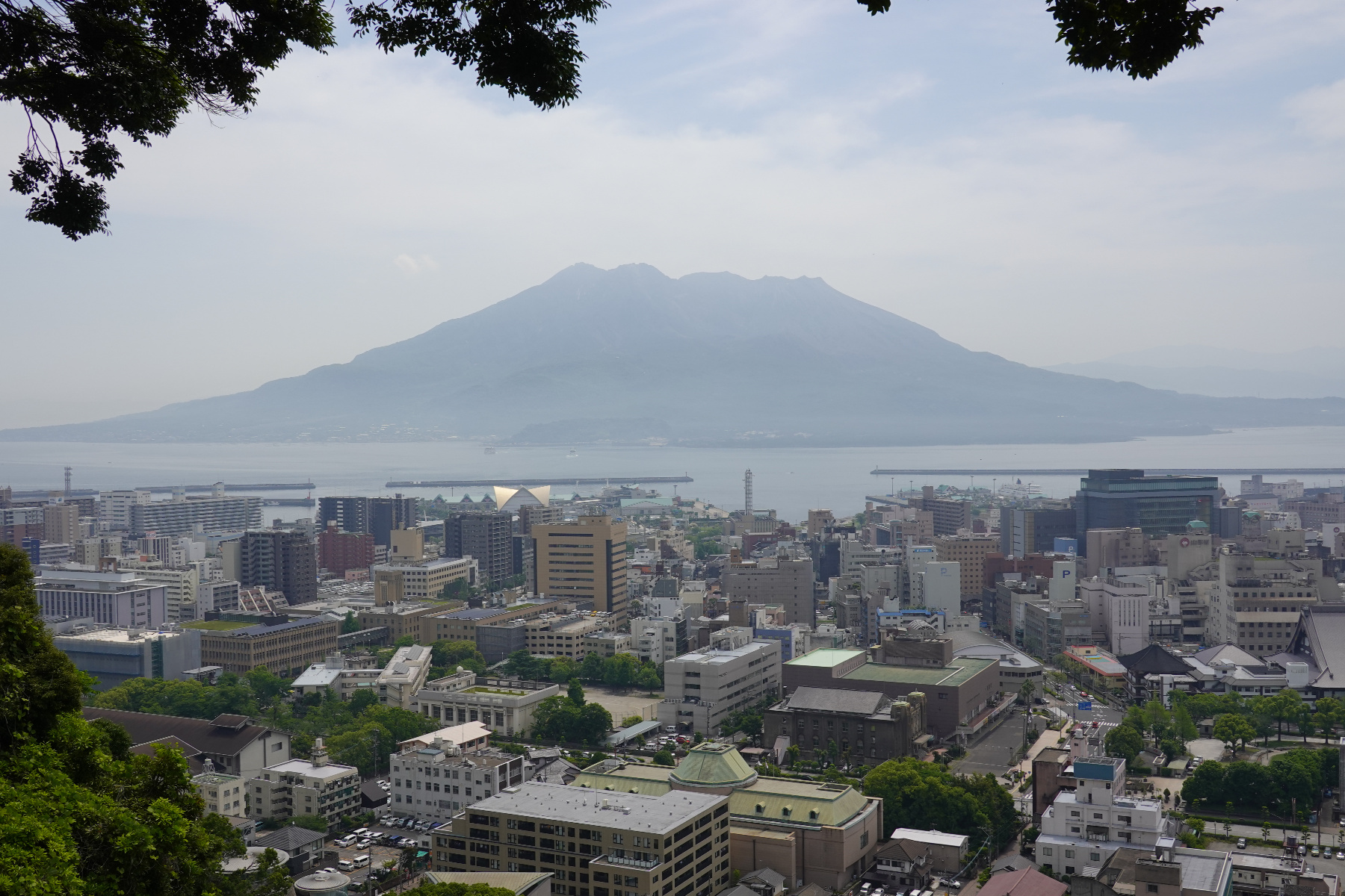 桜島が大きく見えますが霞んでます。途中に海があるせいかな?。鹿児島市街も見えてますが、あまり大きな街では無さそうです。