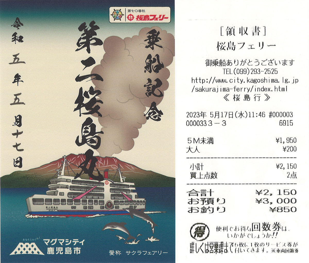 右は乗船の領収書。大人1人200円は安いです。毎日通勤で乗っている人もいるのでしょう。