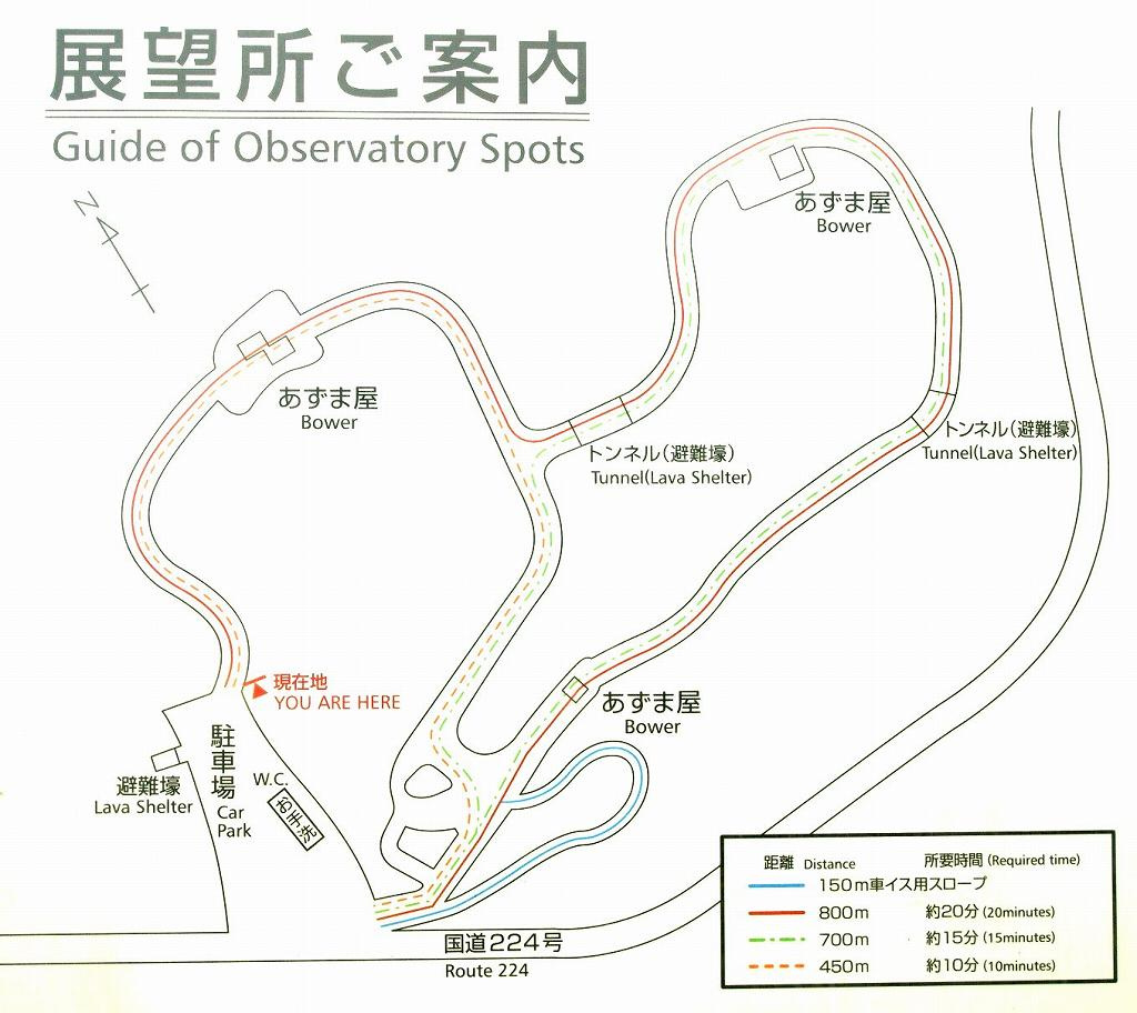 広い範囲に遊歩道が整備されていて所々に展望所(あずま屋がある)や避難壕があります。800m、700m、450mのコースがあり450mのコースだけ歩きました。
