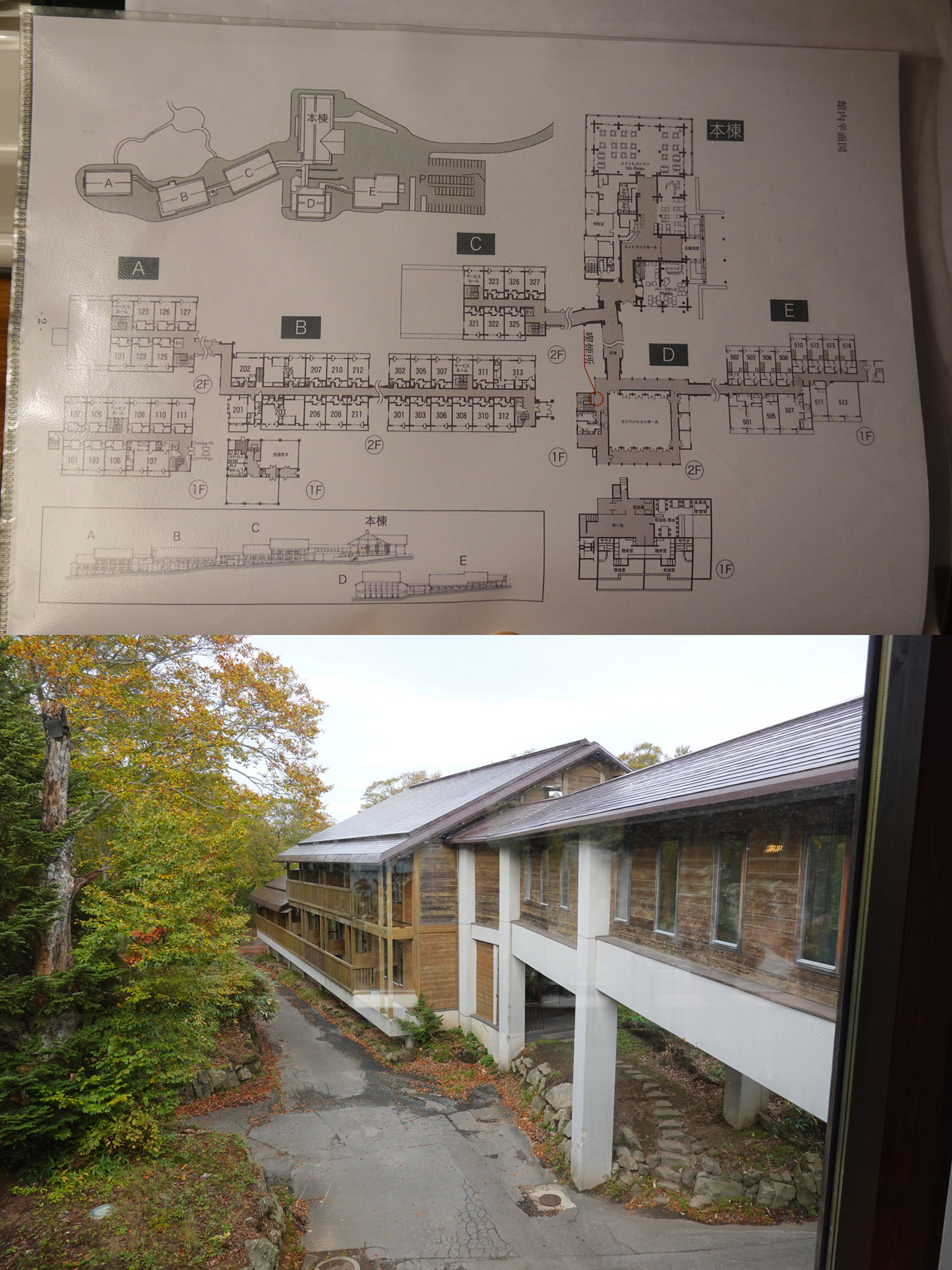 ![]() 館内マップと窓から見えるABC棟方面。 |