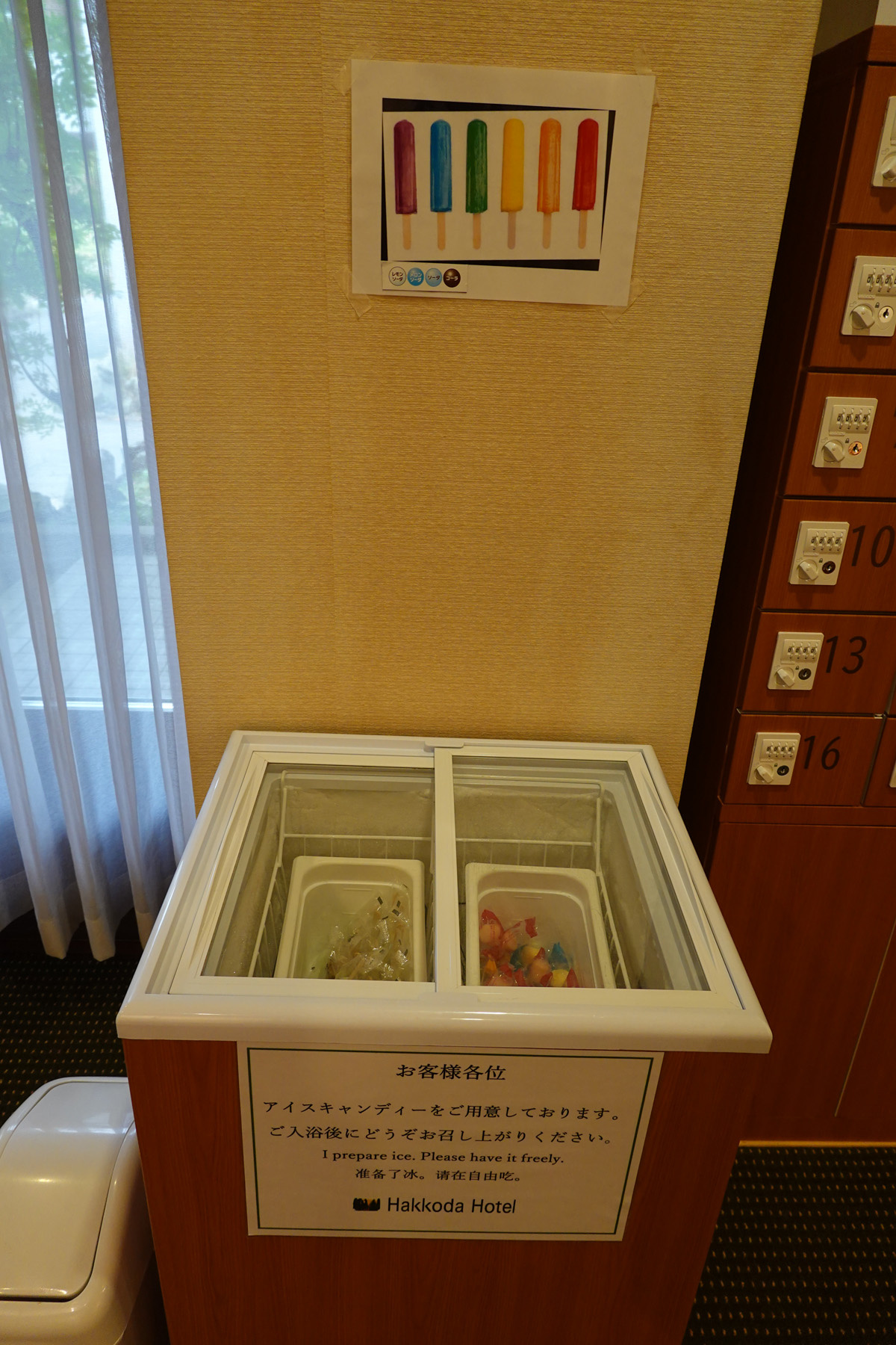 ![]() 浴場を出たところにアイスキャンディーがありました。小さいので毎回2個食べてました。6色あることになっているが3色ぐらいしか無かったような。 |