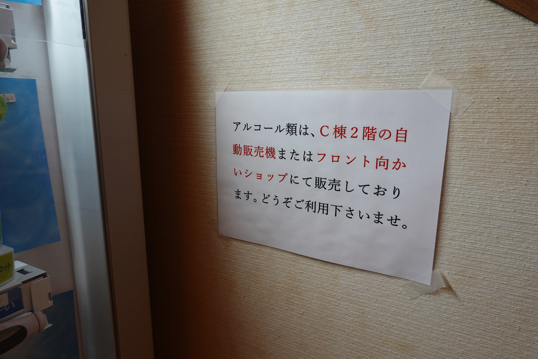 ![]() 自販機もあって当然アルコール類は無いのですが、近くにこんな張り紙が。 |
