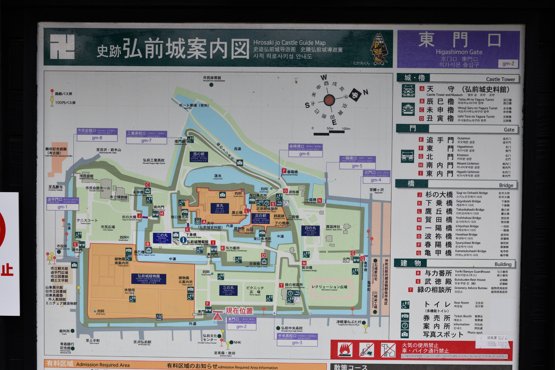 ![]() 弘前城案内図です。東門から入り天守に登って追手門から出ます。 |