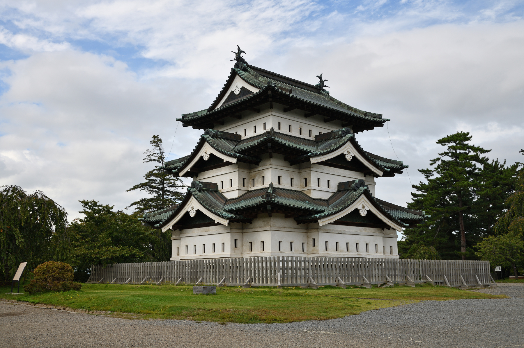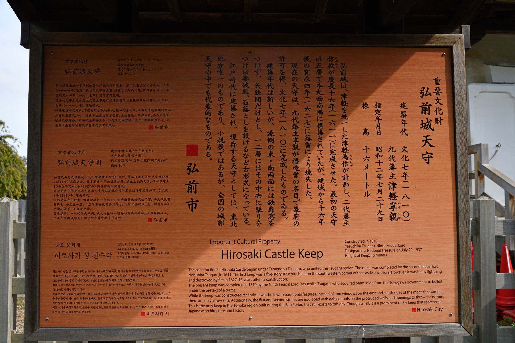 ![]() 天守の説明です。1810年に建築されたもので、江戸時代に建築され現存する天守としては東北地方唯一のものだそうです。 |