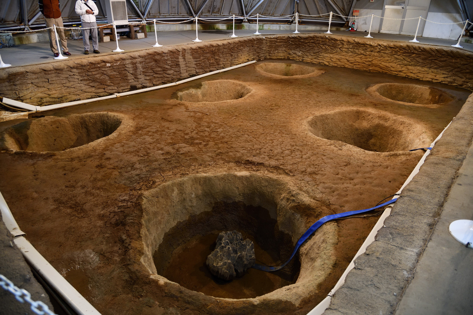![]() 大型掘立柱建物跡です。大きな穴が6個あり、地下水が出てくるそうでホースで排水してました。 |