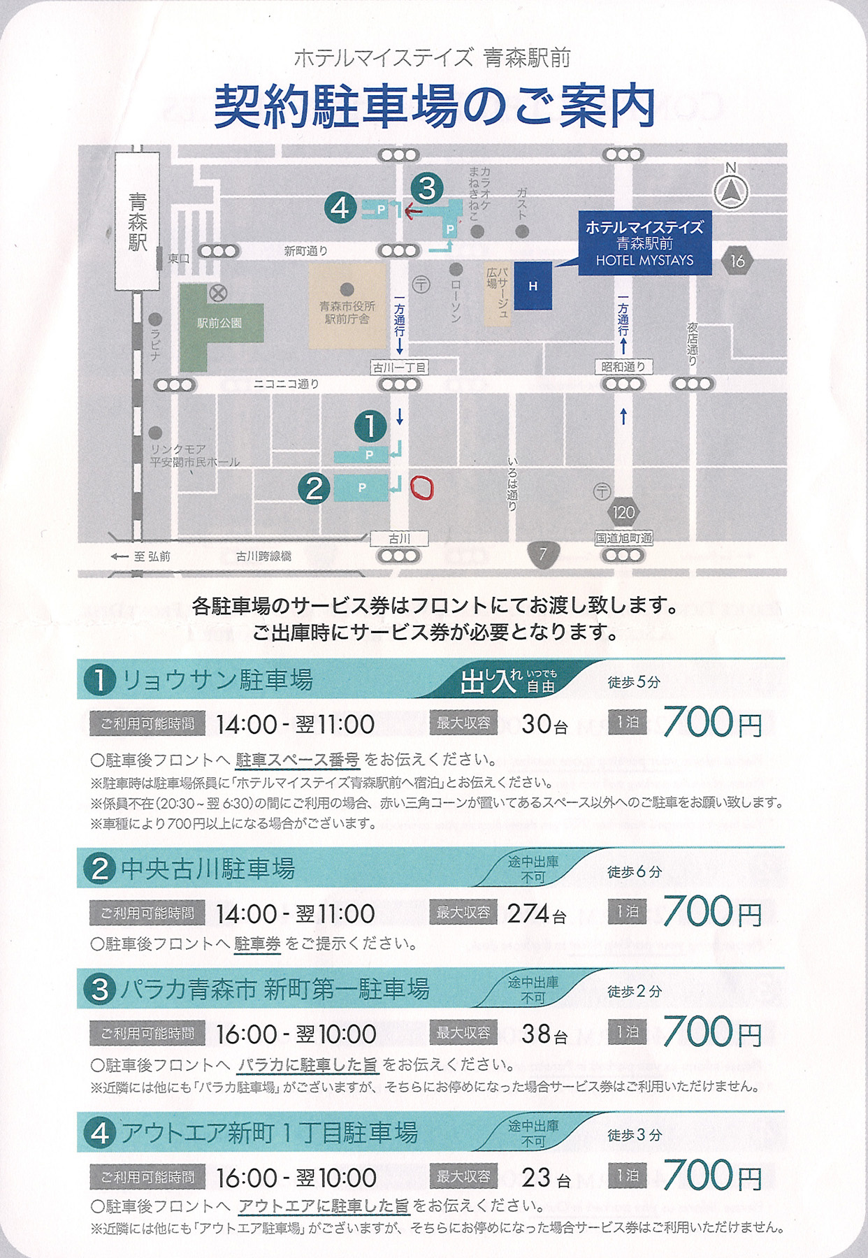 ![]() 提携(契約)駐車場マップです。空きがないと面倒なので1番大きい2に駐めようとしてましたが3に駐める事ができました。3は徒歩2分、2は徒歩7分です。提携の場合、駐車料金は一律1泊700円でした。 |