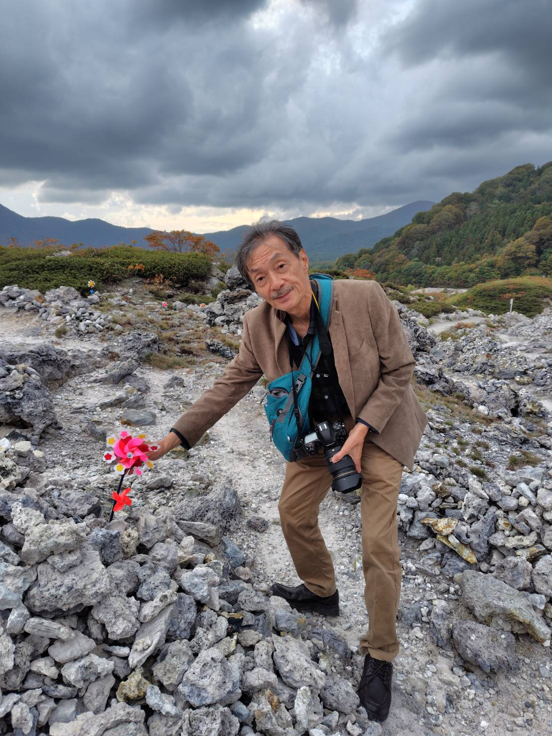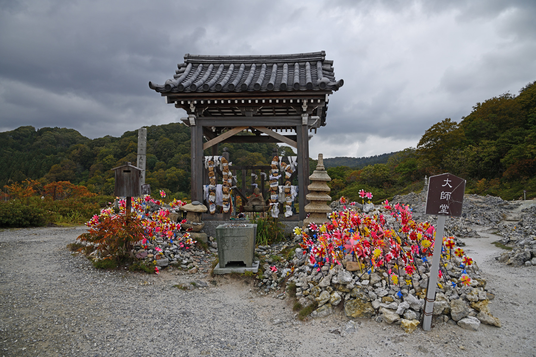 大師堂の周りには夥しい数の風車(かざぐるま)が立ってます。恐山では幼くして亡くなった子供の供養のために風車を立てるのだそうです(風車で遊ぶ?)。